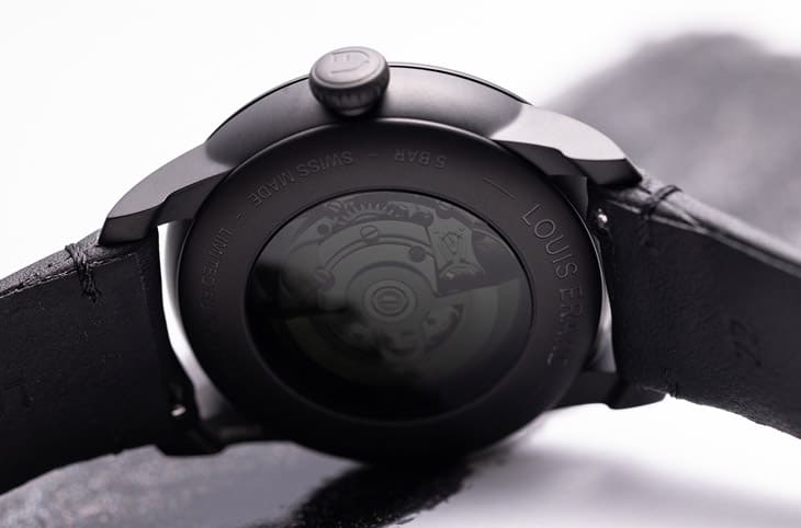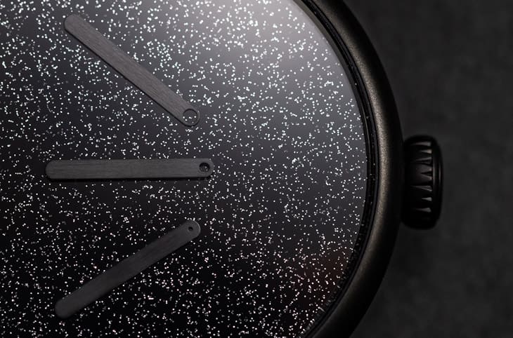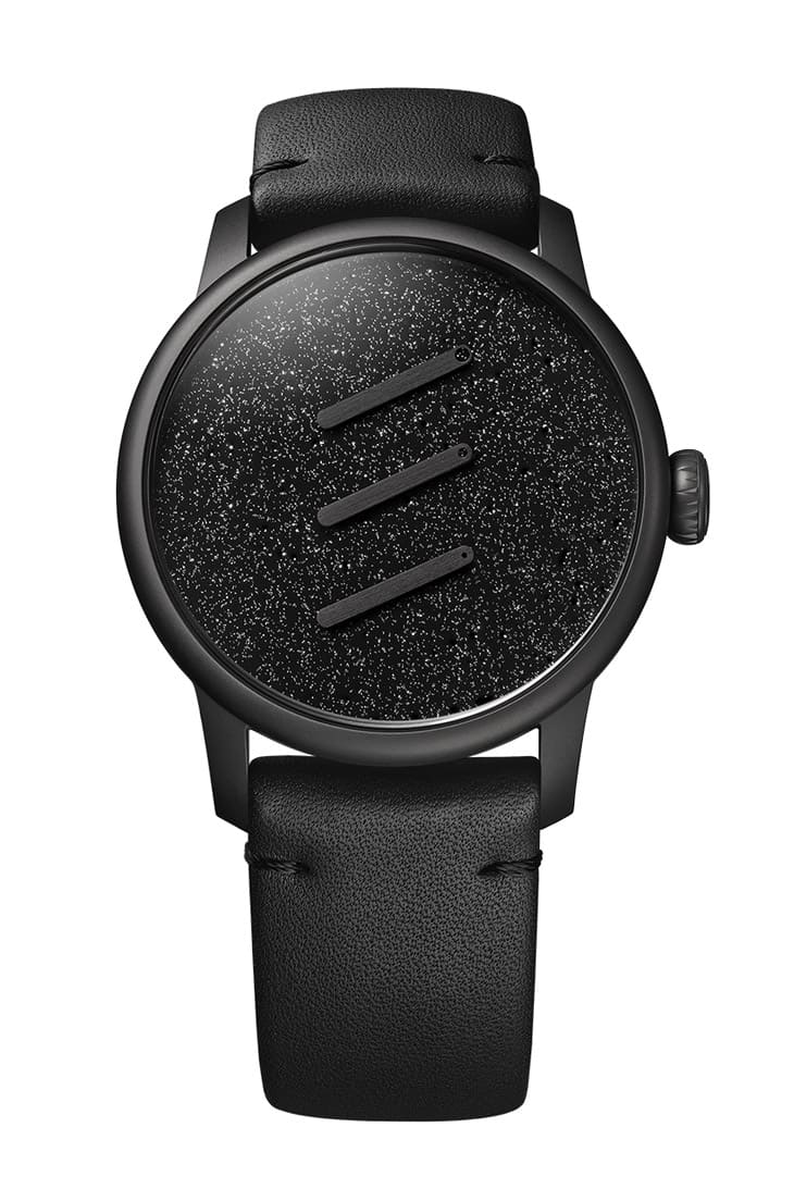LOUIS ERARD x Olivier Mosset三針一線手錶採用黑色PVD不鏽鋼錶殼,而錶帶、面盤以及指針也同樣都是一氣呵成的黑色調,令人印象深刻的是,手錶面盤沒有任何常見的元素,例如品牌Logo、時標、刻度等等(更別提其他非必要的裝飾),不過面盤倒也不是一路黑到底,而是在黑色調中佈滿大量的銀色圓點,有點像是在夜晚中仰望星空般,予人一股心曠神怡的感受。