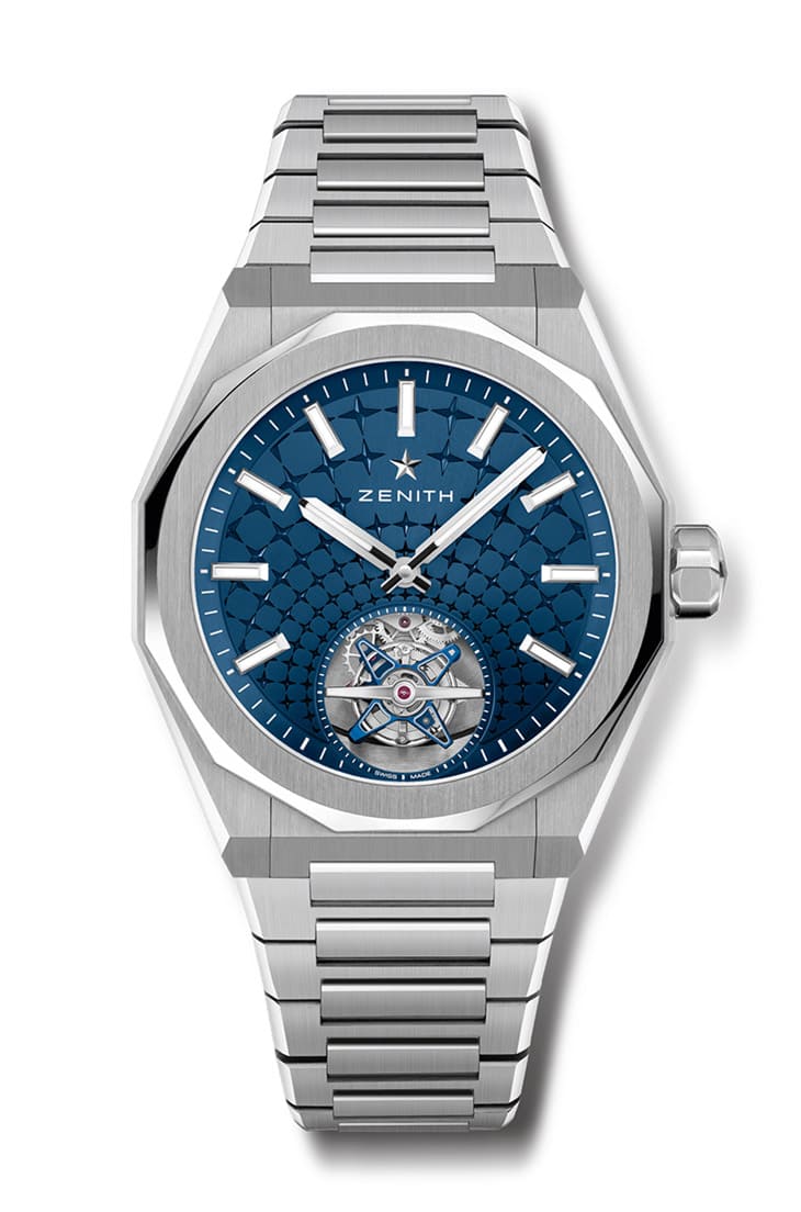 精鋼款與黑色陶瓷款的DEFY Skyline陀飛輪腕錶分別採用藍色與黑色面盤,此款式面盤的招牌設計在於真力時獨家的四芒星圖案,然而新作由於升級為陀飛輪複雜功能,品牌也因此重新設計了面盤的四芒星圖案,由原本整齊的縱橫排列,改為以6點方向的陀飛輪為中心,並往外依序放射出由小漸變至大的四芒星圖案,這使得陀飛輪裝置宛如位於星系的中心,周圍的四芒星圍繞其發出耀眼光芒,烘托陀飛輪每60秒轉一圈的規律動感。真力時為了提升陀飛輪裝置的運作穩定性,機芯在陀飛輪軸心頂部設置經過鏡面拋光,並且帶有斜角處理的固定橋板,加上陀飛輪裝置外圍設有刻度,還能輔佐面盤中心的時、分指針衍生出小秒顯示的功用。