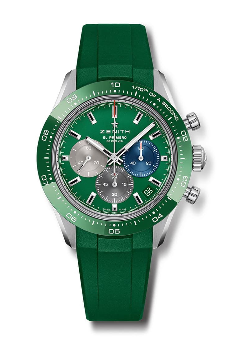提到真力時2024年新作,品牌自農曆新年前夕的LVMH鐘錶週期間已經接連釋出多款引起錶迷興趣的腕錶。包括打破系列配色框架的Chronomaster Sport Green綠色腕錶,真力時繼銀面、白面或黑面的Chronomaster Sport計時碼錶後,以不鏽鋼材質結合綠色陶瓷錶圈和面盤催生出風格更大膽奔放的生力軍。過往Chronomaster系列鮮少有綠色面盤的作品,這次品牌在保有經典的藍色、深灰色、淺灰色三色小錶盤設計之餘,別開生面引進富有活力的綠色面盤與錶圈,跳色的設計不僅不覺違和,反而令人非常驚喜、留下深刻第一眼印象。真力時此次外替Chronomaster Sport Green綠色腕錶設計鍊帶以外、系列首見的整合式綠色橡膠錶帶,與腕錶搭配相得益彰,對於追求獨特性的人士而言獨具魅力。