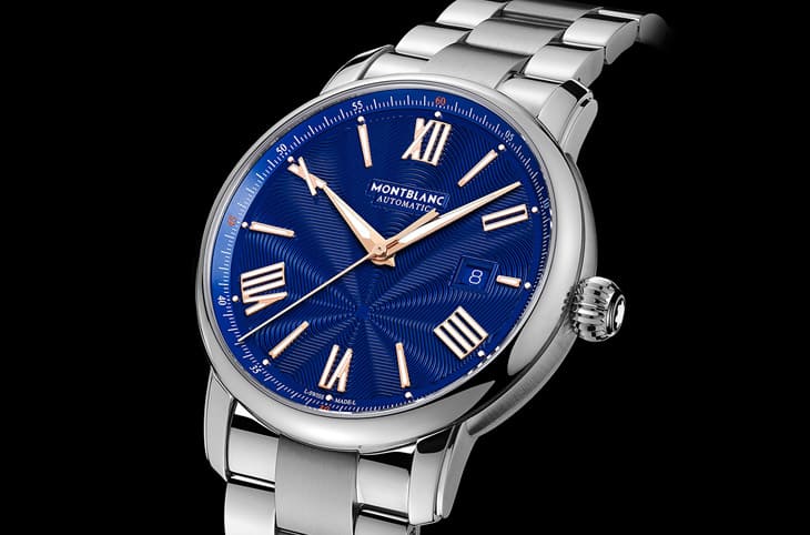 明星傳承系列日期顯示自動錶限量款800的面盤格局為簡約大三針,3點方向設有日期顯示,面盤獨樹一幟的六角星扭索紋鍍上藍色,象徵著白朗峰當地的嚴寒氣候,品牌特別將時標與指針鍍上玫瑰金色,在藍色背景的襯托下散發高雅個性。面盤外圍的分鐘刻度分別設有以5分鐘間隔的小型夜光圓點與以15分鐘間隔的橘色圓點標示,其與指針和時標上的夜光塗層都有提升辨時清晰度的效果,另外日期視窗底下的轉盤為藍底搭配白色數字,看起來同樣一目瞭然。錶款搭載MB 24.17自動機芯,擺輪震頻為28,800vph,動力儲存38小時則是中規中矩。