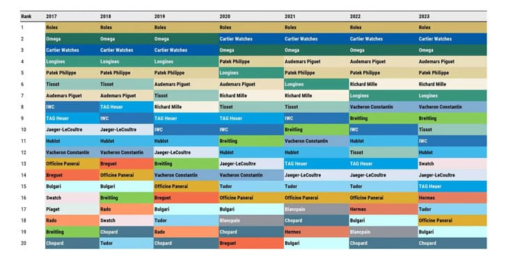 前10名中有像是江詩丹頓這樣的大品牌突破自我,他們的年度銷售額推估達到10.97億瑞郎,除了比2022年有感成長18%以外,江詩丹頓也是首度突破10億瑞郎這個門檻,排名前進兩名,來到第8名的位子,加入錶壇其他「十億俱樂部」熱門暢銷菁英品牌的行列。