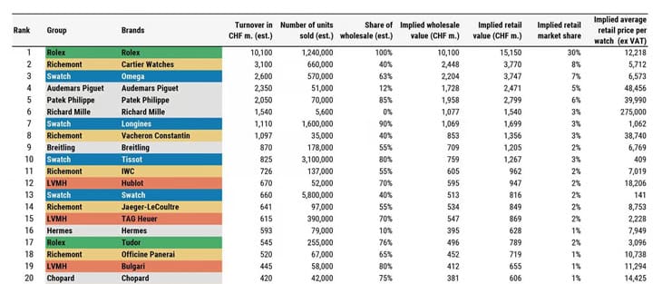 ▲2023年銷售表現最佳的前20個瑞士手錶品牌預估銷售額、年產量以及市場分額等資訊。Source:LuxeConsult, Morgan Stanley