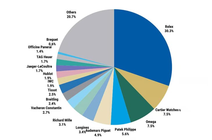 大摩和LuxeConsult的報告還指出,勞力士2023年的年產量估計達到124萬只,和2022年差不多、帶有微幅成長(3%),好消息是,報告指出勞力士2023年針對水鬼系列和不鏽鋼手錶的產量有拉高比例,從中可以看出品牌也正在努力改善排隊等候名單過長的問題。而勞力士衝破100億瑞郎的年度銷售額有多誇張呢?簡單來說如果你把排在後面的卡地亞、歐米茄、愛彼AP和百達翡麗的年度銷售額全部加起來,也只能大概和勞力士一個品牌打平而已。報告中最後下了一個結論:放眼全球市場,沒有任何一個奢侈品品牌能在自己的領域表現出如同勞力士在鐘錶圈的主宰能力;以路易威登的皮件為例,我們印象中他的代表性以及知名度都很高,但其實他們家的皮件市占率也「只」有19%,不像勞力士一個品牌就佔了錶壇3成之多。