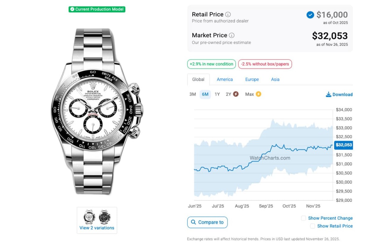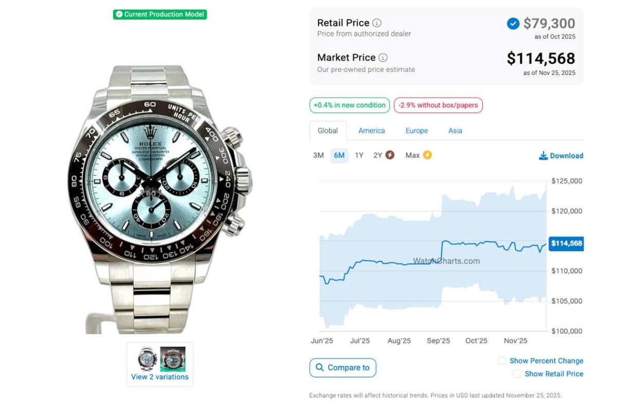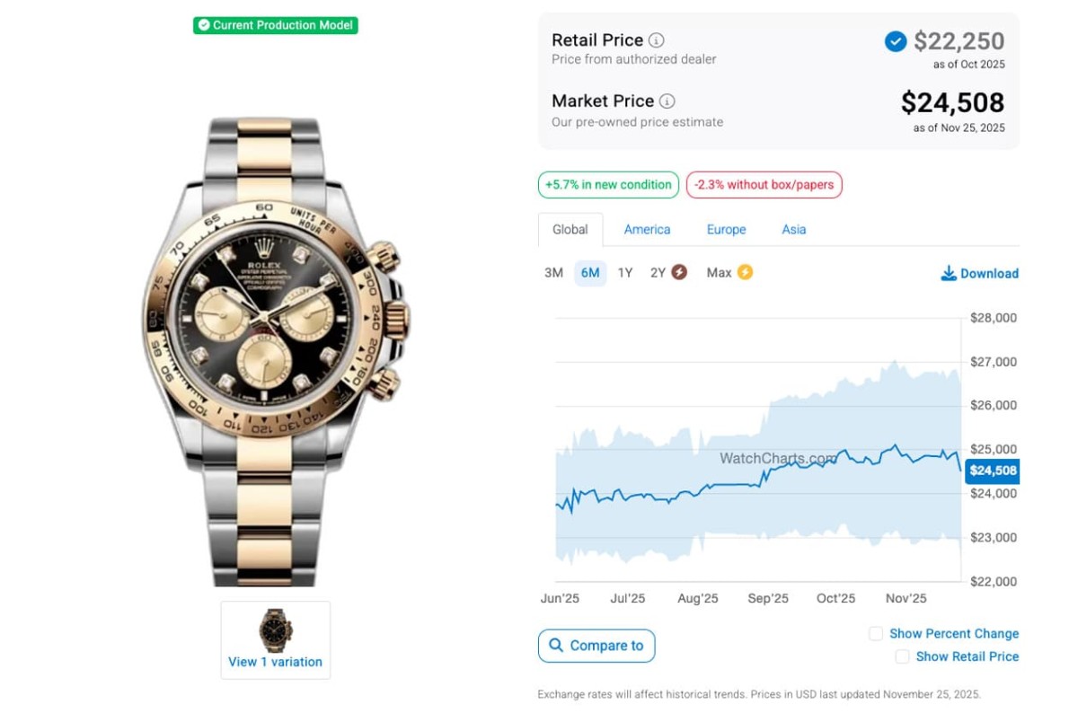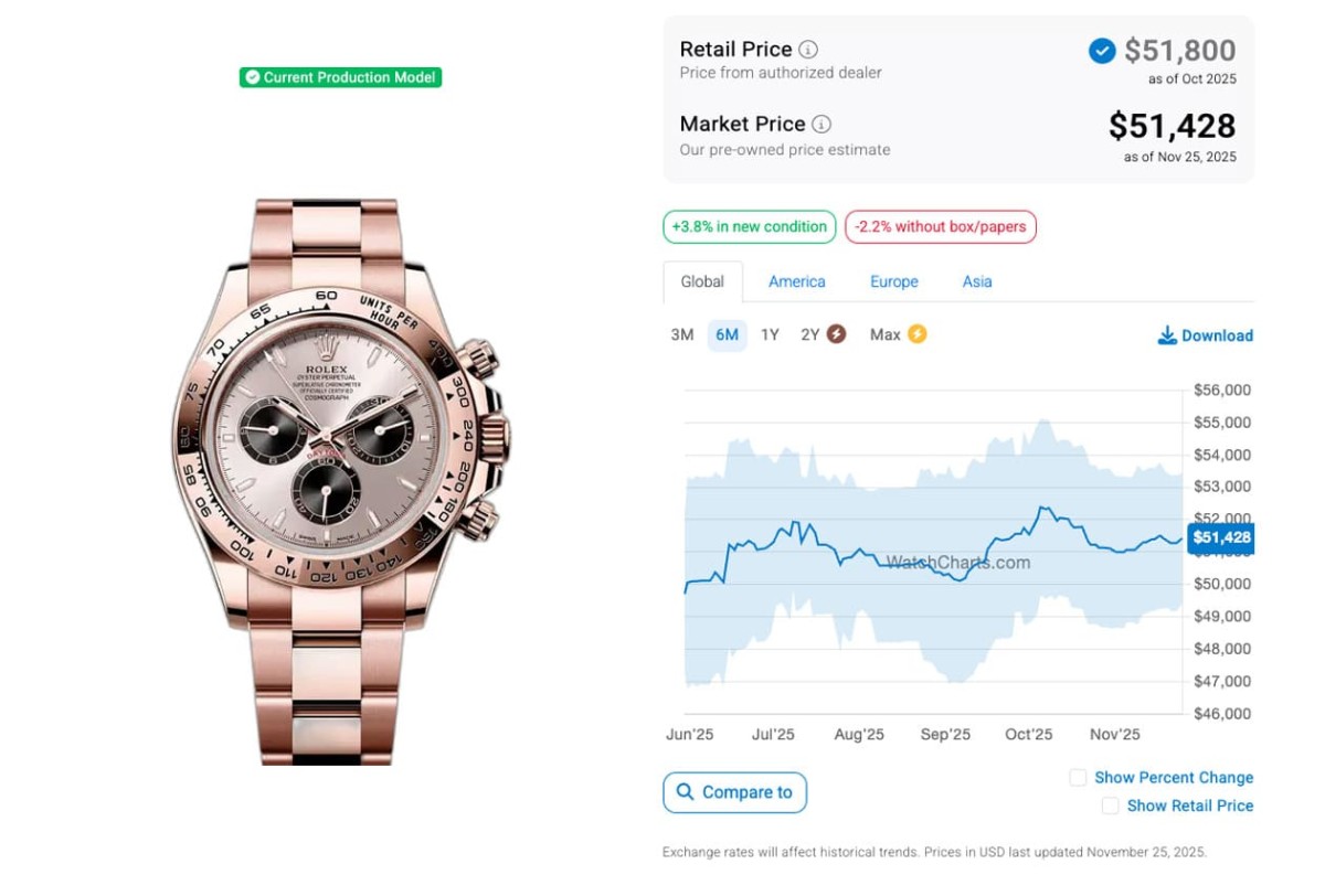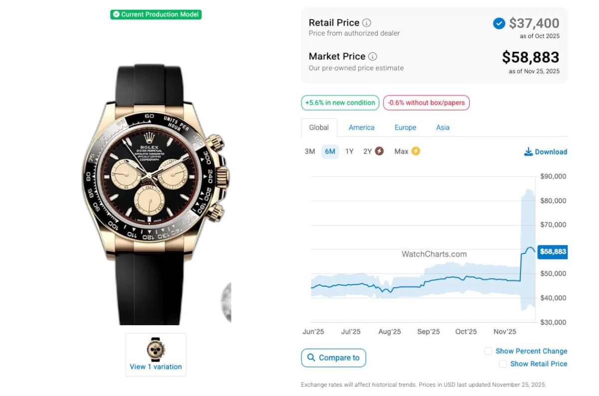 到了2025年11月底,當現行版Daytona進入二級市場的款式與數量愈來愈多,加上熱門錶行情下修的趨勢似乎已到谷地反彈的地步,因此前述的六種型號身價起起伏伏後,比起半年前大多有所成長。同樣由WatchCharts的資料可見,目前Daytona各款最新報價分別是鋼殼白面126500LN-0001:32,053美金(約合台幣100萬6)、鋼殼黑面126500LN-0002:27,827美金(約合台幣87萬3)、半金時標鑲鑽款126503-0002:24,508美金(約合台幣77萬)、永恒玫瑰金款126505:51,428美金(約合台幣161萬4)、黃金款126518LN:58,883美金(約合台幣184萬8),以及鉑金款126506:114,568美金(約合台幣359萬6)。之前受到美國對等關稅政策、通膨疑慮等因素影響,以及黃金價格持續高升的情況下,導致貴金屬錶殼和半金錶殼的Daytona今年以來二級市場行情紛紛走高,但是到了11月情勢又有點變化,黃金款在這個月以來突然飆高,短短一個月前後行情差異不少,直接衝到一年來的價格高點令人始料未及。