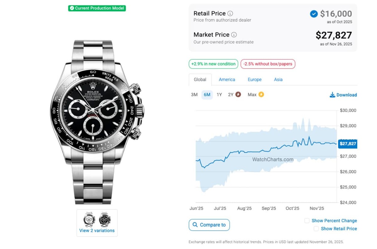 根據高級手錶市場調查研究機構WatchCharts的資料,現行版Daytona系列各種材質在2025年5月時二級市場的價格早已經開始由高點往下走,鋼殼白面126500LN-0001那時的行情為30,720美金(約合台幣96萬4)、鋼殼黑面126500LN-0002為26,732美金(約合台幣84萬)、半金時標鑲鑽款126503-0002為23,760美金(約合台幣74萬5)、永恒玫瑰金款、黃金款、鉑金款型號126505、126518LN、126506的身價依序是49,709美金(約合台幣156萬)、44,228美金(約合台幣138萬8)和109,153美金(約合台幣342萬6),除了永恒玫瑰金之外,金額大多數在定價以上,系列的高人氣由此可見一斑。