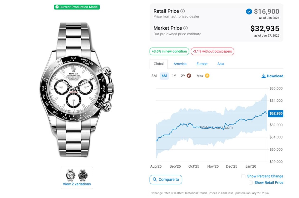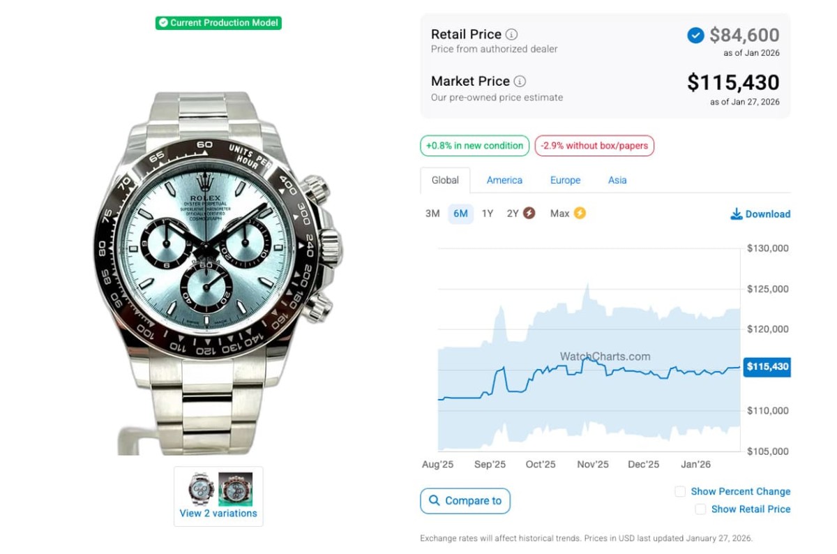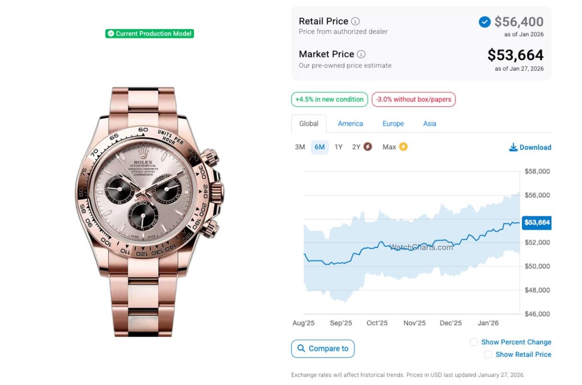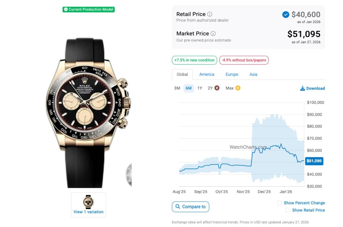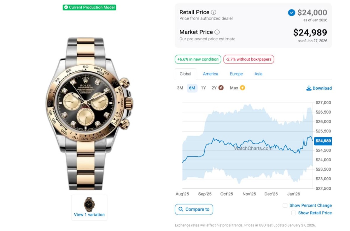 到了2026年1月底,當現行版Daytona進入二級市場的款式與數量愈來愈多,加上熱門錶行情下修的趨勢似乎已到谷地反彈的地步,因此前述的六種型號身價起起伏伏後,比起半年前竟都有所成長。同樣由WatchCharts的資料可見,目前Daytona各款最新報價分別是鋼殼白面126500LN-0001:32,935美金(約合台幣103萬)、鋼殼黑面126500LN-0002:28,259美金(約合台幣88萬4)、半金時標鑲鑽款126503-0002:24,989美金(約合台幣78萬)、永恒玫瑰金款126505:53,664美金(約合台幣168萬)、黃金款126518LN:51,095美金(約合台幣159萬8),以及鉑金款126506:115,430美金(約合台幣361萬)。之前受到美國對等關稅政策、通膨疑慮等因素影響,以及黃金價格持續高升的情況下,導致貴金屬錶殼和半金錶殼的Daytona去年的二級市場行情紛紛走高,但是到了12月以及跨完年後情勢又有點變化,半數款式身價一個月前後有所成長,唯獨黃金款126518LN有特別明顯的下滑趨勢,至於鋼殼白面126500LN-0002、半金126503-0002以及永恒玫瑰金126505-0003倒是在2026年一開始行情還有再往上的軌跡,為今年寫下漂亮開局。