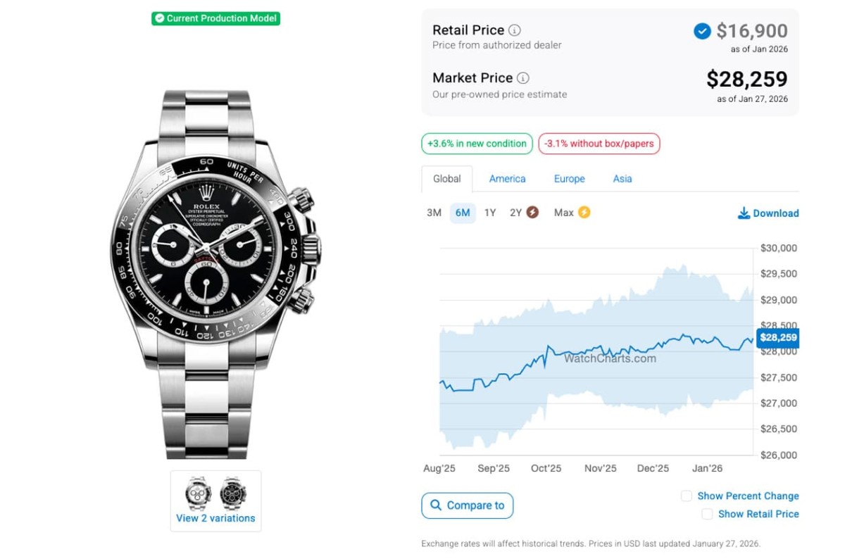 根據高級手錶市場調查研究機構WatchCharts的資料,現行版Daytona系列各種材質在2025年8月時二級市場的價格早已經開始由高點往下走,鋼殼白面126500LN-0001那時的行情為30,728美金(約合台幣96萬)、鋼殼黑面126500LN-0002為27,388美金(約合台幣85萬6)、半金時標鑲鑽款126503-0002為23,846美金(約合台幣74萬6)、永恒玫瑰金款、黃金款、鉑金款型號126505、126518LN、126506的身價依序是51,040美金(約合台幣159萬6)、42,856美金(約合台幣134萬)和111,366美金(約合台幣348萬4),除了永恒玫瑰金款之外,金額大多數在定價以上,系列的高人氣由此可見一斑。