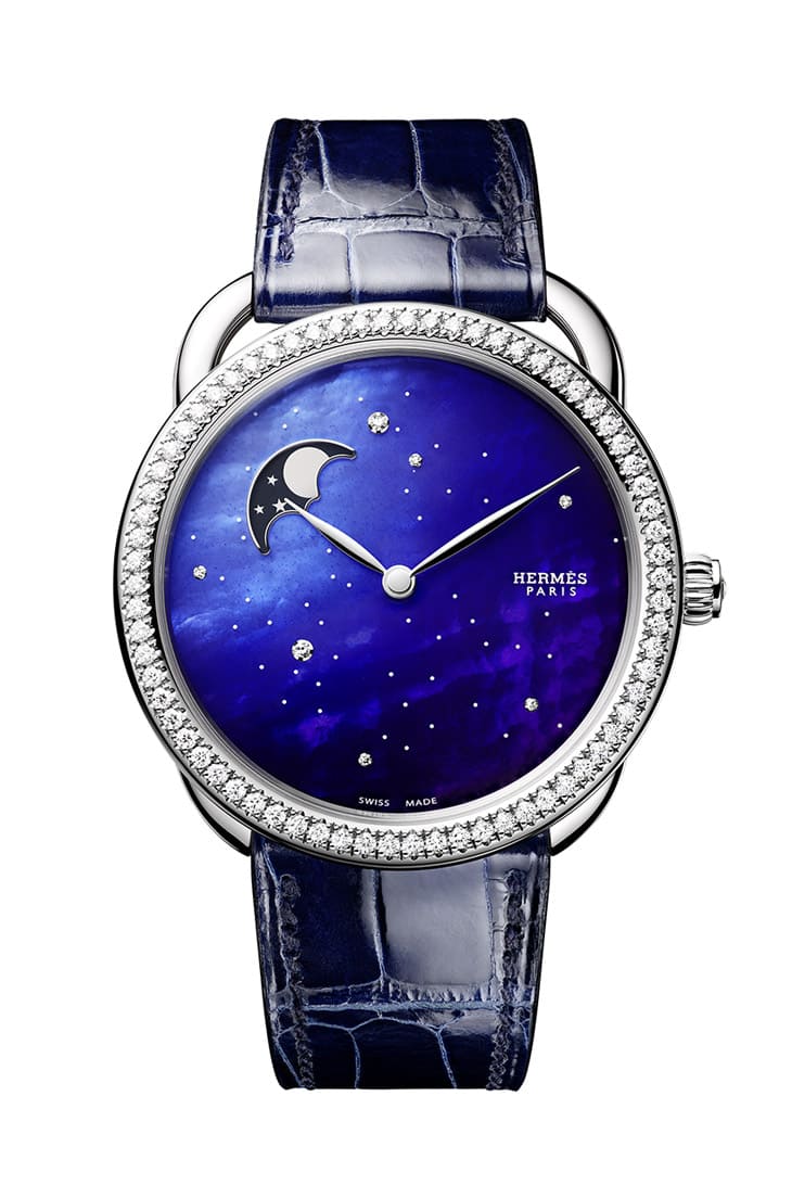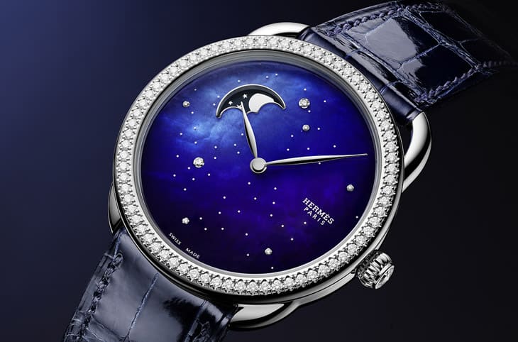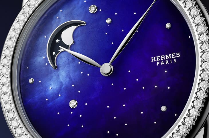 手錶面盤以帶有幻變光澤的珍珠母貝材質為基底,愛馬仕特別在珍珠母貝表層圖上藍色亮漆,錶面盤上的藍色呈現由淺到深的變化,輔以珍珠母貝材質原本具備的光澤變化效果,烘托出高掛在11點方向的扇形小月相視窗的月相推移軌跡。月相盤的背景點綴著星星圖案,就連面盤也鑲有7顆大小不一的鑽石,搭配其他象徵星體的圓點隱隱排列出知名星座在夜空中的相對位置。