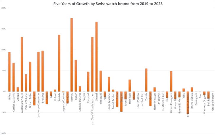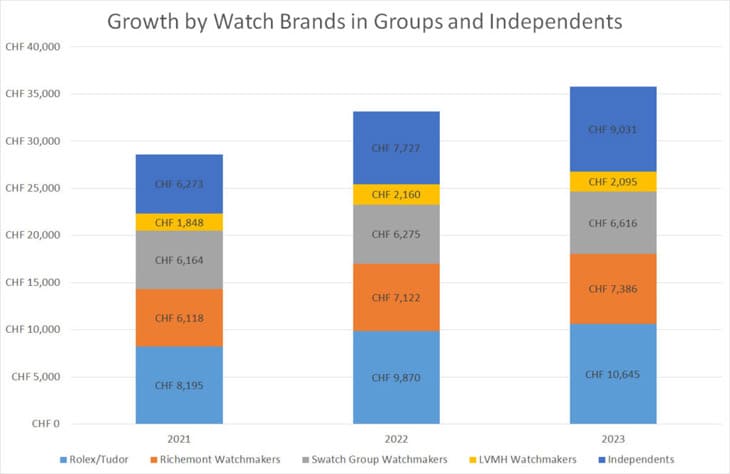 首先,從各品牌的銷售情況來看,獨立營運的品牌整體來說會比大集團品牌有更佳的銷售表現,例如報告中提到從2019~2023這五年內,獨立營運的品牌銷售額平均成長幅度達到43%,反觀規模甚巨的集團如Richemont、Swatch和LVMH等,他們旗下的品牌在同期內的銷售額成長幅度「僅」為16%,雖然兩種類型的品牌都有正成長,不過成長幅度多和少還是有較為明顯的差異。