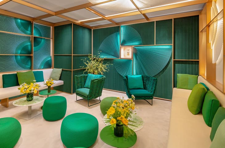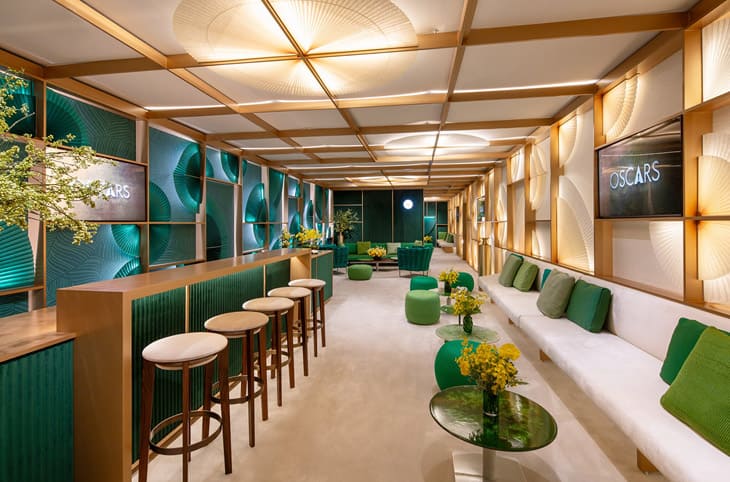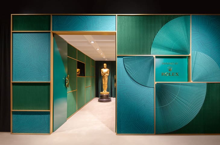 ▲勞力士為第96屆奧斯卡獎打造的綠坊休息室以植物世界的綠色調為基礎,並以扇子獲得靈感,在室內空間裝點綴金黃或綠色的各式扇形圖案。