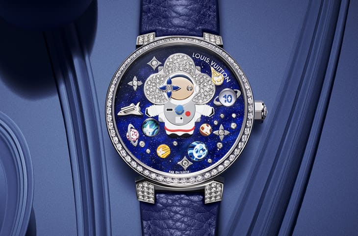 ▲路易威登創作出新款Tambour Slim Vivienne跳時錶,品牌運用高超的裝飾工藝,分別呈現櫻花與太空人兩大主題。