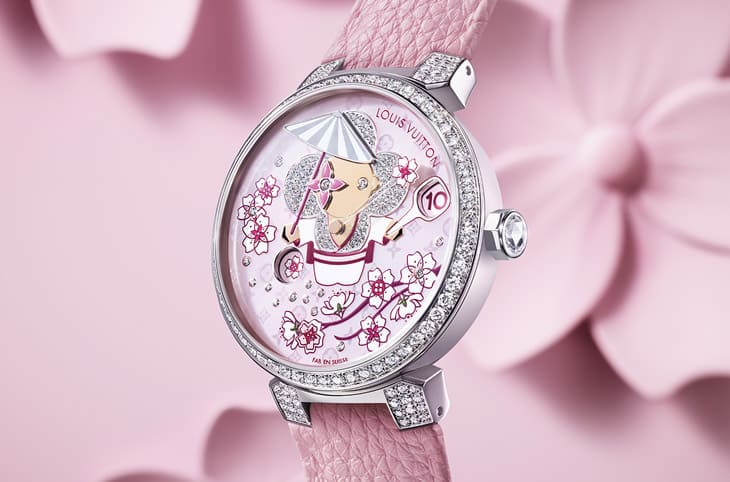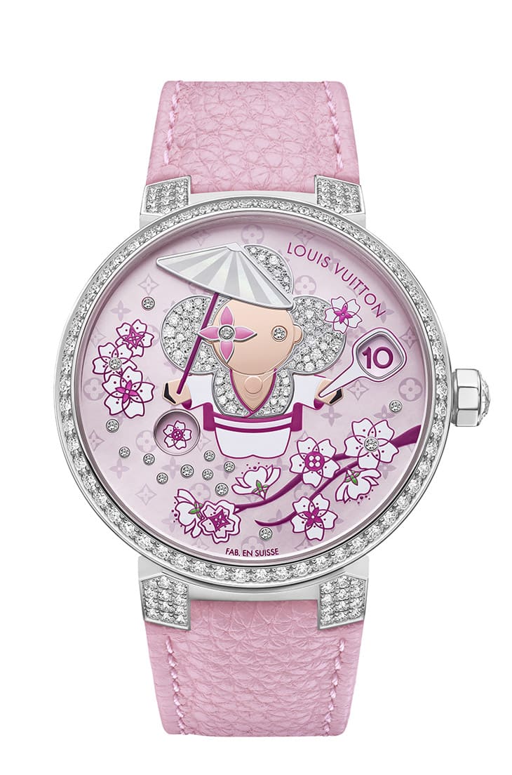 在櫻花款部分,手錶的錶殼鑲滿鑽石,並搭配粉紅色Taurillon皮革錶帶展現出一股嬌柔氣息,至於面盤則是以粉紅色珍珠母貝製成,路易威登利用「全像字母圖案」(Holomonogram)技術,在面盤上塑造出虹彩色的Monogram Flower背景圖案。面盤上還交錯鑲有鑽石裝飾以及品牌工藝師手繪的櫻花與樹枝圖案。