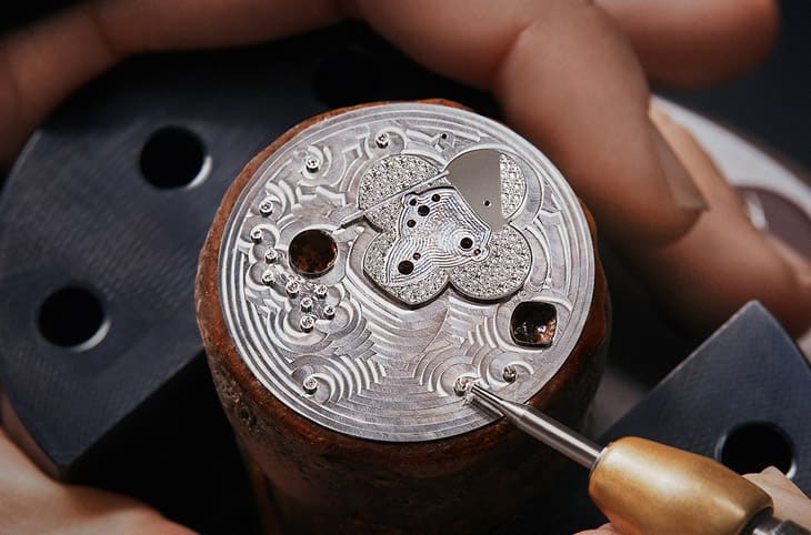 ▲品牌工藝師在面盤先雕刻出Vivienne的輪廓,接著再於表面鑲嵌、上色,達成最終繽紛豐富的面盤畫面。