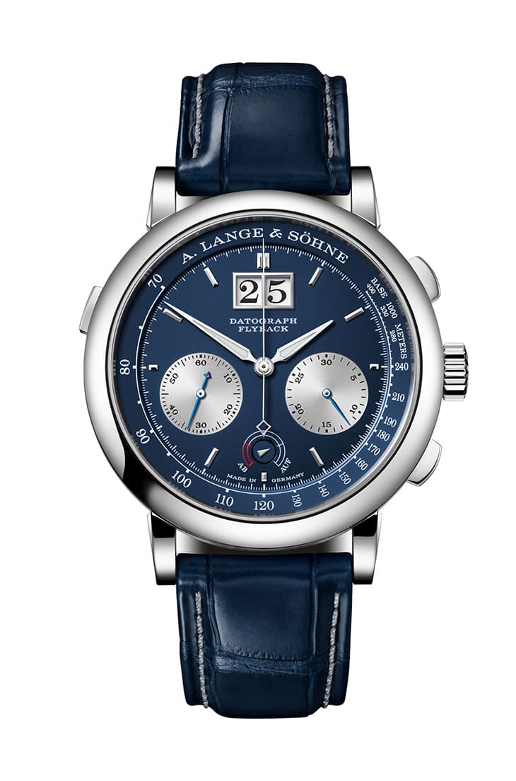朗格在此款現有的玫瑰金與鉑金款之外,新增加白金錶殼搭配藍色面盤的作品,手錶為了呈現一體和諧感,因此鱷魚皮錶帶也改成藍色。先前的Datograph Up/down不論錶殼材質為何,面盤都是黑色,這次朗格迎接系列週年一方面加入白金材質這個選項,同時也難得將面盤改成藍色,這並非什麼巨幅的變化,可是手錶整體的視覺感受卻能有微妙的不同。換了材質與顏色的Datograph Up/down,面盤格局還是很有特色,除了大日期視窗,3點與9點方向分別為計分盤與小秒盤,雙眼小錶盤並沒有與面盤軸心齊平,而是略低於軸心的設計構成一個三角形的概念,而在面盤6點方向還有一個小巧的動儲顯示,讓人能夠掌握L951.6手上鍊機芯的60小時動力消長。 L951.6機芯由451枚零件組成,複雜度比一般計時碼錶高許多,它擁有導柱輪搭配水平離合機制,機芯也還握擁朗格擺輪游絲及具有偏心砝碼的擺輪,震頻達每小時18,000vph,計時精準度達1/5秒。