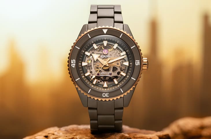 RADO雷達表的人氣作品Captain Cook庫克船長系列持續推陳出新,品牌以市面上少見的橄欖綠色陶瓷加上PVD玫瑰金,詮釋出如同黎明時分,城市中高樓大廈之間所穿射出來的光芒那幕大都會叢林景象,賦予庫克船長高科技陶瓷鏤空錶煥然一新的樣貌。