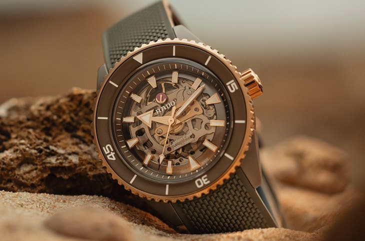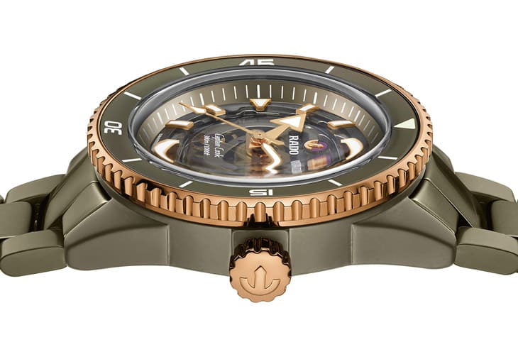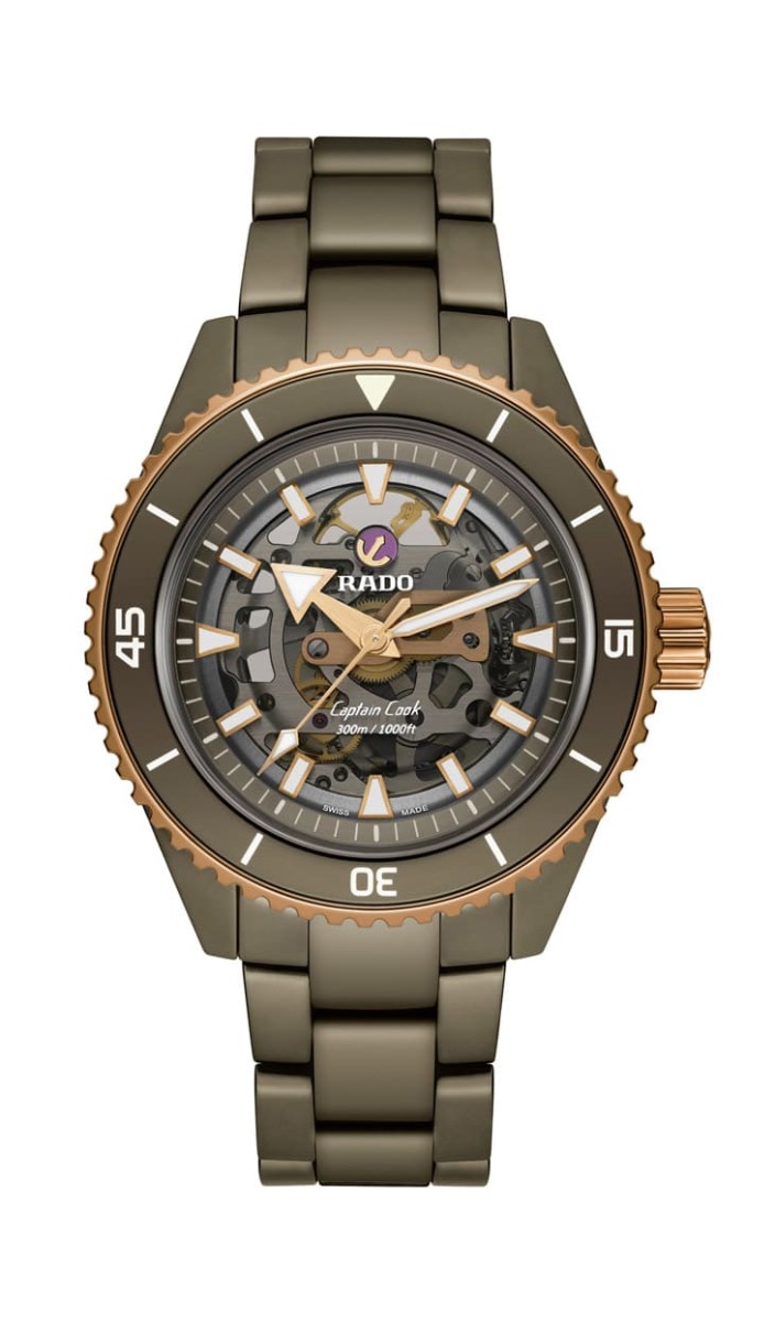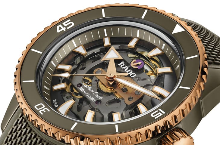 全新庫克船長高科技陶瓷鏤空錶以高硬度、保護性佳的陶瓷製作錶殼,而且它的陶瓷款還是黑、白等主流色以外的「特殊色」,光是錶殼的陶瓷顏色就已經建立起手錶的鮮明印象,同時雷達表也替其配置了綠色橡膠錶帶或橄欖綠色高科技陶瓷三排鍊節練帶等兩種款式供錶迷擇其所愛。手錶的旋入式錶冠以及錶圈組件都鍍上了玫瑰金色,使得手錶不只有休閒運動感,還伴隨一股低調的高雅個性,同時其防水性能達到300米,在日常生活佩戴無往不利。