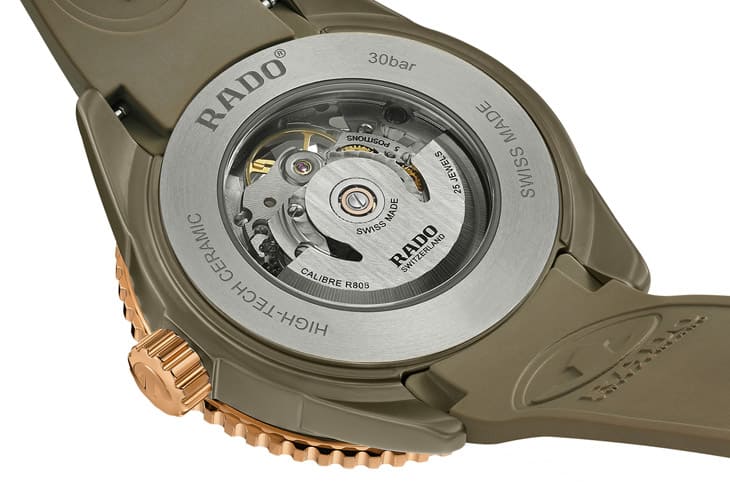 霧面橄欖綠色高科技陶瓷、玫瑰金色PVD材質/R808自動上鍊機芯/時、分、秒顯示/藍寶石水晶鏡面、透明底蓋/防水300米/錶徑49.8x43mm/參考價:NT$ 134,400(膠帶)、NT$ 145,400(陶瓷鍊帶)