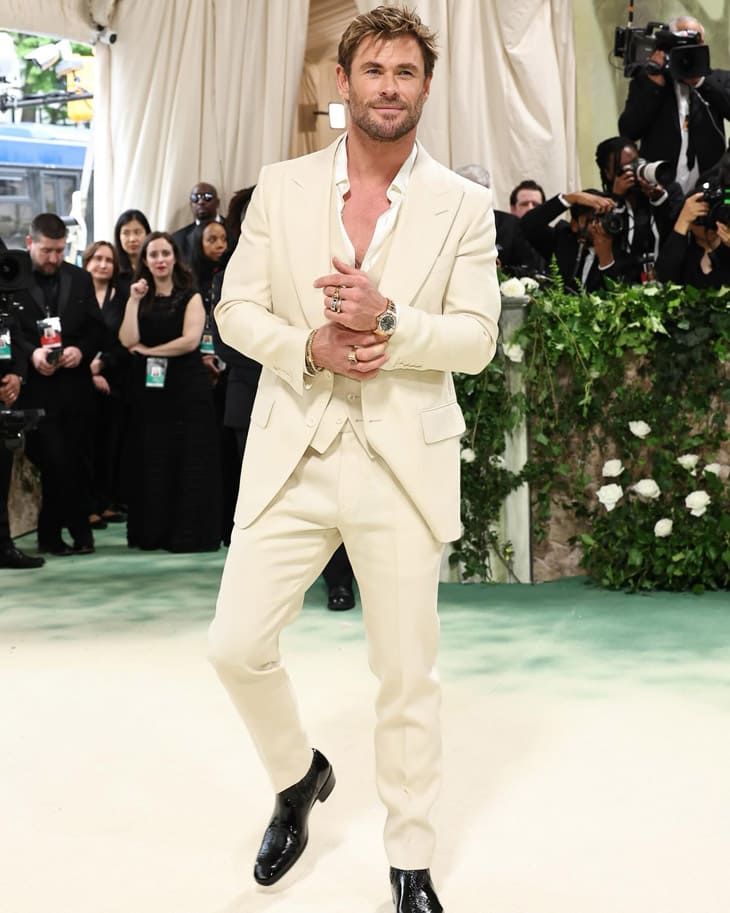 「雷神索爾」克里斯漢斯沃和Brooklyn Beckham都選擇穿著一襲淺色西裝並稍微露了一下他的胸肌,至於他手上戴的是之前比較少看到他戴的蕭邦Alpine Eagle玫瑰金鑲鑽款,剛好這款錶靈感源自阿爾卑斯山的自然生物,與這次的Dress Code也有關聯。