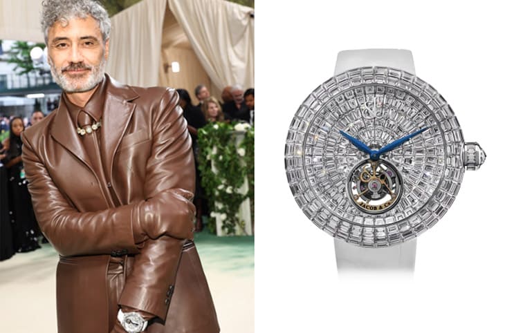 鬼才導演塔伊加維迪提這天穿了全皮的西裝、襯衫、領帶有點浮誇,這點和他手上的JACOB & Co.滿天星Royal Tourbillon搭配得天衣無縫,手錶從錶殼、錶冠到面盤都被滿滿的矩形切割鑽石包覆,面盤上只露出品牌Logo、藍鋼指針和陀飛輪,很有效地聚焦視覺重心。