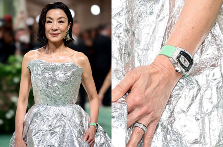 被網友虧說像是穿著皺掉的錫箔紙出場的奧斯卡影后楊紫瓊雖然造型不是這麼容易看懂,但是他手上那只RICHARD MILLE卻是毫無疑問完美襯托影后氣場。手錶的透明錶殼內外鑲滿了鑽石,而楊紫瓊還把錶帶換成了薄荷綠色,這點和花園裡的盎然生機也有彼此呼應的味道。