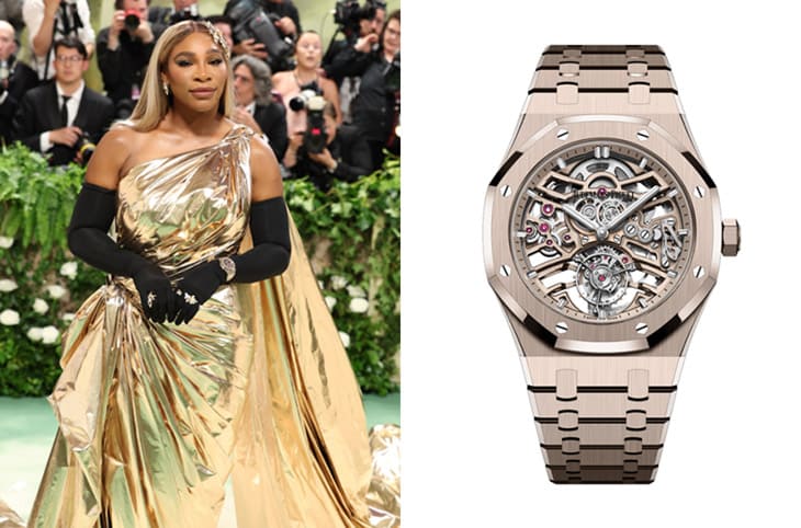 退休後的網壇天后小威廉絲並沒有閒著,至少像是Met Gala這種時尚大舞台他也相當樂於前往共襄盛舉,有別於我們平常對於小威身著網球服的印象,他在晚宴上穿了閃亮亮的正裝,手上戴著長期和他保持密切合作關係的愛彼AP手錶,那是品牌2024年才剛推出不久的沙金皇家橡樹鏤空飛行陀飛輪!