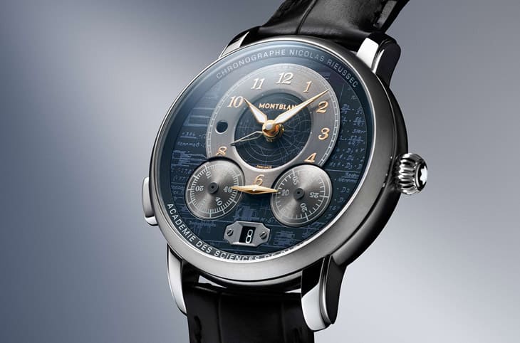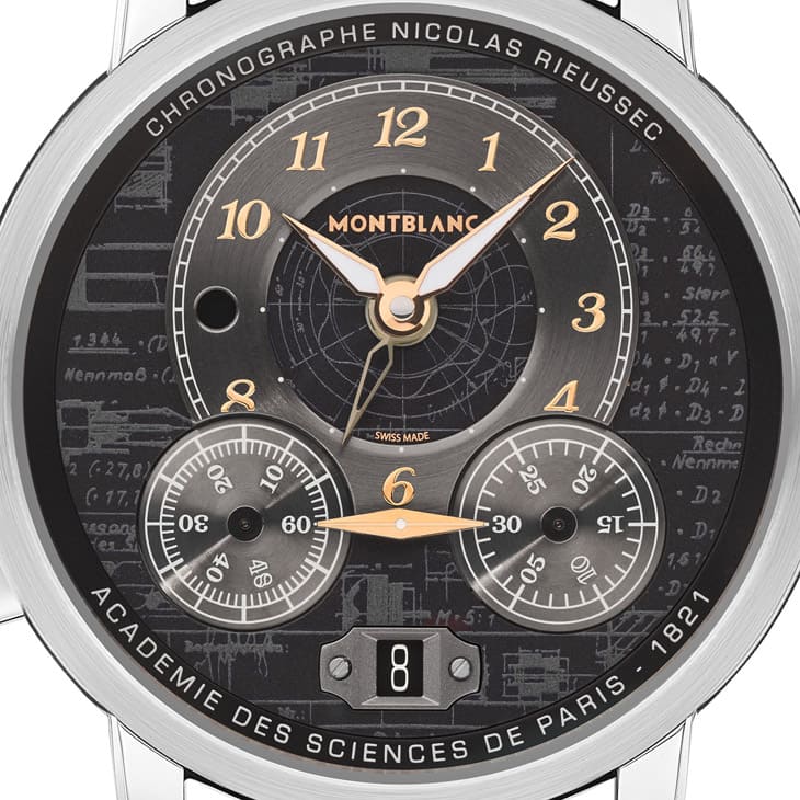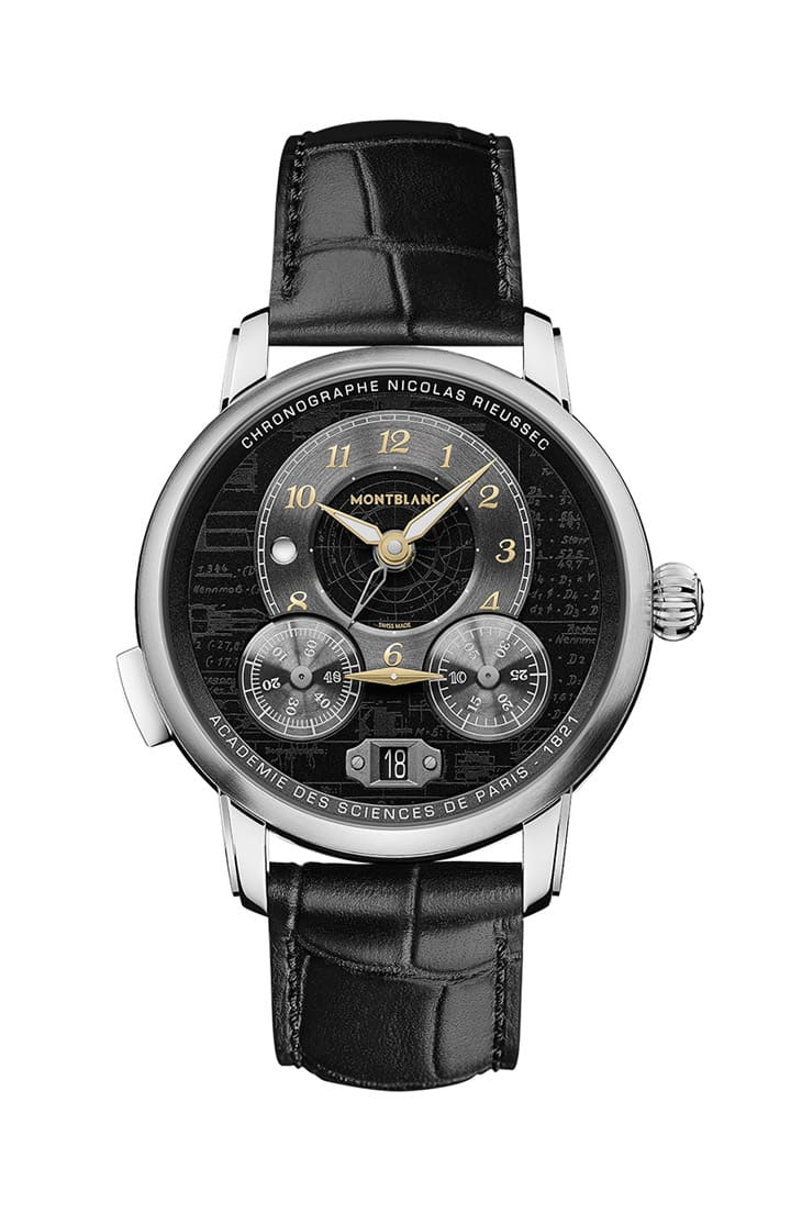 大師傑作系列的書寫工具有一些共同特徵,例如它的筆身、筆蓋常以黑白色搭配金色元素,因此這組配色也就成了特別版手錶的重要視覺概念。錶款採用不鏽鋼製成,搭配黑色鱷魚皮錶帶先一步塑造出猶如書寫工具予人紳士高雅個性。萬寶龍以Nicolas Rieussec計時碼錶做為這款錶的基礎,代表它和一般常見的計時碼錶不盡相同,最主要的差別在於手錶的計時結果不是用小錶盤搭配指針顯示,而是仿效Nicolas Rieussec 19世紀時所設計的計時器裝置,利用面盤下方兩枚小轉盤之間的金色雙頭指標顯示(轉盤自己會旋轉藉以呈現計時結果)。