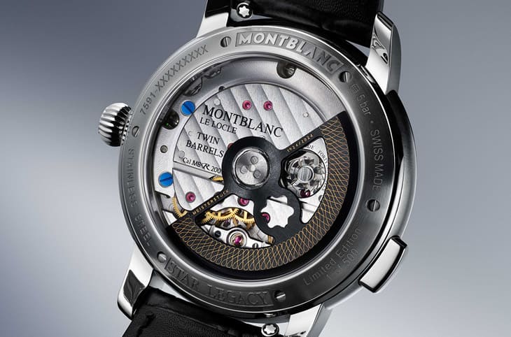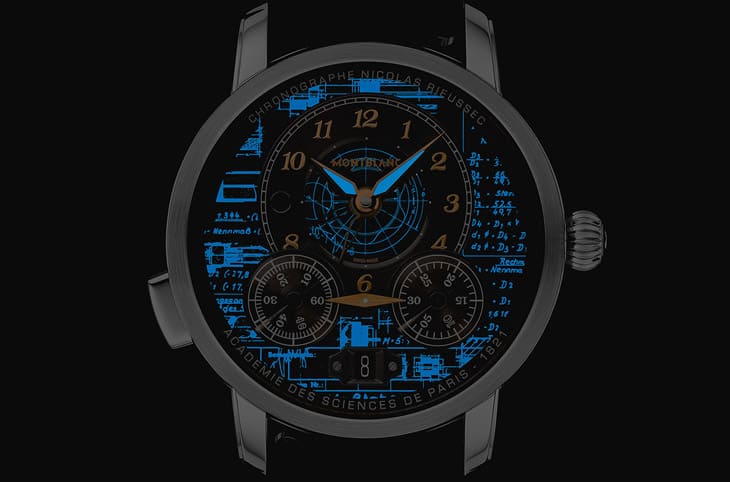 明星傳承系列Nicolas Rieussec計時碼錶大師傑作系列100週年限量款500的面盤與錶帶同為黑色,可是它並非純粹的黑色,因為萬寶龍於其上增添了1920年代那款書寫工具的設計藍圖,包括偏心錶盤內部同樣也延續了藍圖的一部分,而且偏心錶盤部分的藍圖比較不一樣,它畫的是品牌代表性六角白星標誌的比例圖——這個圖案在每一支大師傑作系列書寫工具的筆蓋上都看得到。這些圖案和時、分指針都塗上了夜光塗層,所以手錶在黑暗環境中會發出藍色夜光,讓佩戴者清楚辨識時間之餘,也能更明顯看到藍圖上的內容