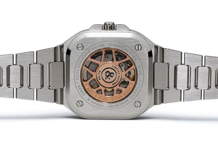 錶背的圓形透明底蓋和其周圍的去角方形又是另一個對比鮮明的環節,手錶搭載的BR-CAL. 321-1於此可以一窺大概,因為它的玫瑰金色鏤空自動盤佔滿了機芯背面大範圍空間,跳脫傳統的半月形自動盤設計一如這款錶予人自成一格的印象,佩戴者還是可以透過鏤空地帶望向更下層的機芯結構。這枚機芯動力儲存達54小時,整體防水性能也達到100米水準,從視覺感受再到實際規格等層面,手錶完全符合品牌創作的動機,讓人同步擁有輕奢與運動機能的全面性都會風格。