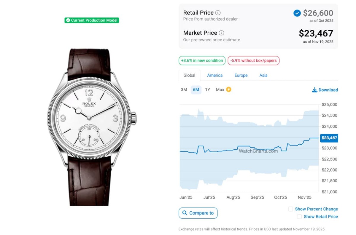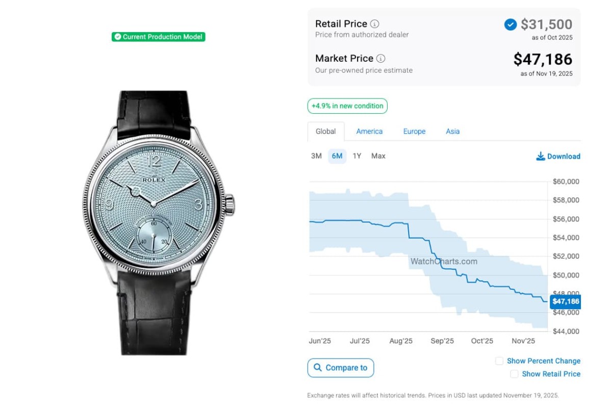 根據高級手錶市場調查研究機構WatchCharts的資料,1908系列的發展似乎慢慢走上Cellini系列的舊路,因為在2025年5月時,當時黃金材質的52508二級市場價格約為24,384美金(約合台幣76萬)、白金材質的52509行情則是22,844美金(約合台幣71萬3),至於鉑金材質行情還很驚人有55,719美金(約合台幣174萬)這麼高,先出的兩款當時都已跌破定價,主要因為那時候1908系列已經不算新,至於晚一年出道的鉑金冰藍面還在享受蜜月期的紅利,溢價率是此系列的標竿;又過了半年後的現在,若對照勞力士其他熱門錶的情況而言,1908系列的行情應該也是持續往下走才是。