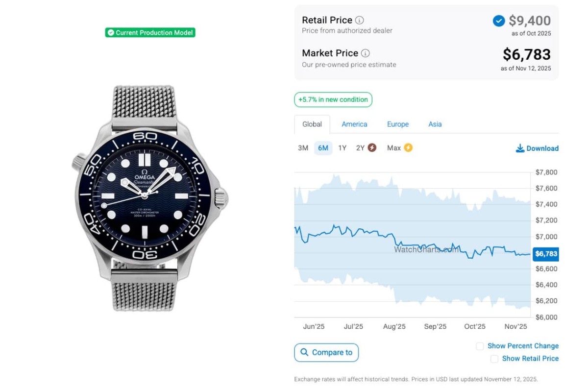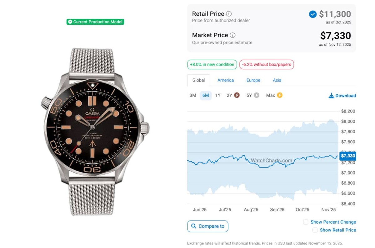 而在經過半年之後的現在,同樣從WatchCharts觀察的數據可知,兩款錶經過這段時間以來的發展,行情又出現了一點變化,210.90.42.20.01.001(007限定款)這期間價格有漲有跌,國外報價在7,100~7,300美金之間來回震盪,進入到2025年前2個月為止行情開始直直落,可是2月中旬後身價又彈起來,到了4月才又往下落,7和8月各短暫衝到今年新高,9月價格一度走下坡到10月後則又出現上揚局勢,二級市場價格為7,330美金(約合台幣22萬7)。而210.30.42.20.03.002(龐德電影60週年紀念款)則有點每況愈下,它的超定價行情持續到2024年5月中以後正式告終,在那之後連續一年多國外報價都是呈往下跌的走勢,尤其2025年6月整月開低走高,到7月又連續震盪,如今進一步跌到剩下6,783美金(約合台幣21萬),已經比007限定款更低價了,行情已經是出道後的新低,加上歐米茄在2024年底又接連推出同樣配置米蘭鍊帶的海馬潛水300米,使得龐德電影60週年紀念款過往的那種特別感被稀釋,二級市場行情與007限定款逐漸拉近。