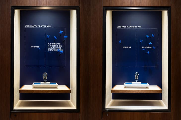 一走近寶鴻堂鐘表台北旗艦店的亨利慕時2024新品鑑賞展,一眼會注意到亨利慕時藍色陳列櫥窗,進入店內後細看每個展示櫥窗內會看到不同的文案,品牌還以射飛鏢射進標靶裡的創意呈現,讓人見識到亨利慕時幽默的製錶理念。櫥窗的簡約造型就與品牌所展示的錶款呼應,這也是我們對亨利慕時手錶最普遍且基本的印象。