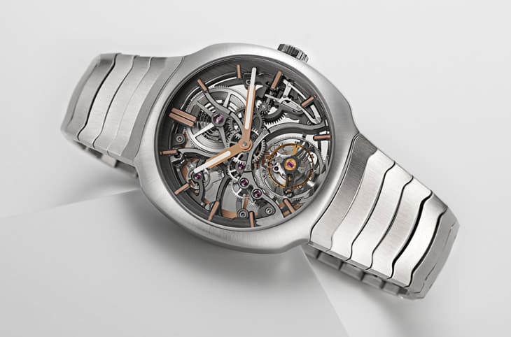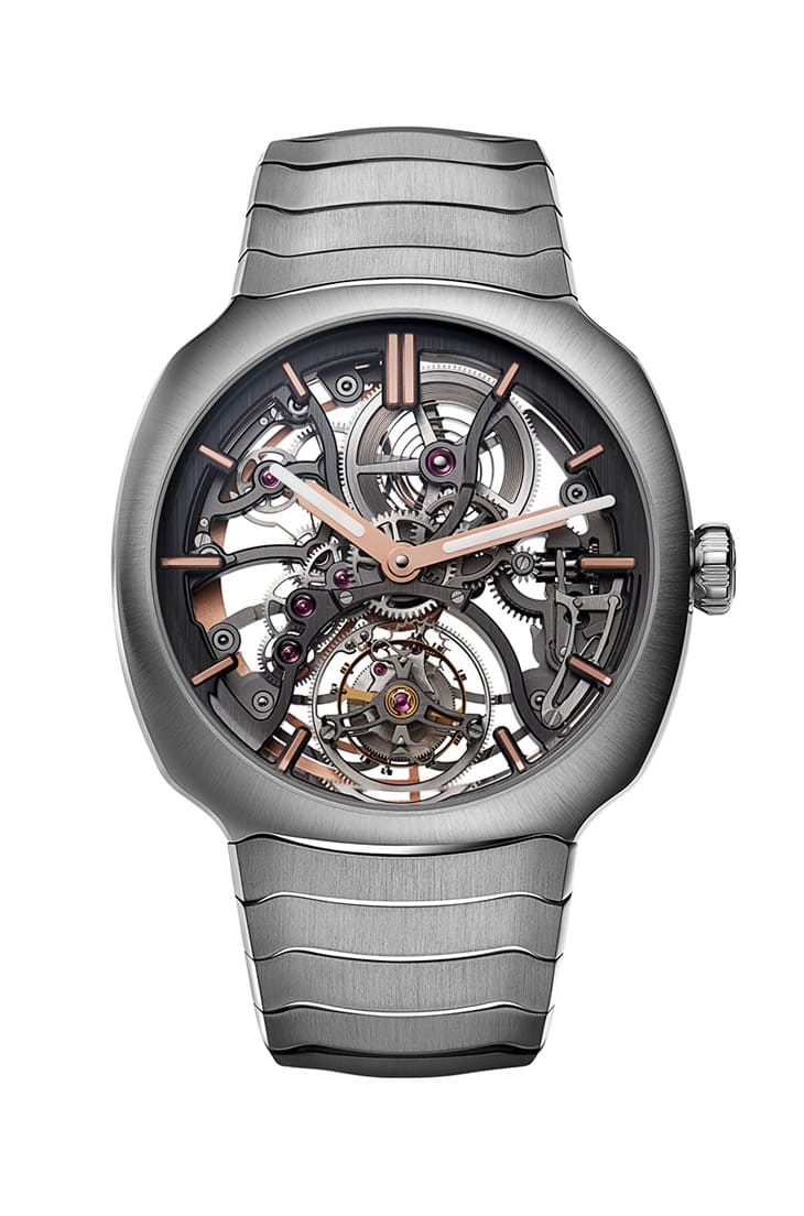 ▲疾速者鏤空陀飛輪簡潔表面修飾極具現代感,碳灰色主夾板及橋板飾以拉絲紋和精細倒角處理。