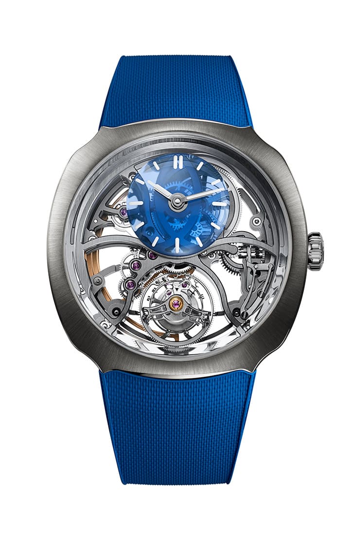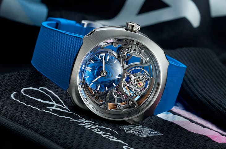 ▲疾速者圓柱鏤空陀飛輪Alpine限量版12點鐘位置可見半透明弧形小錶盤,用上亨利慕時及Alpine Motorsports 的招牌藍色。