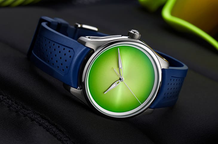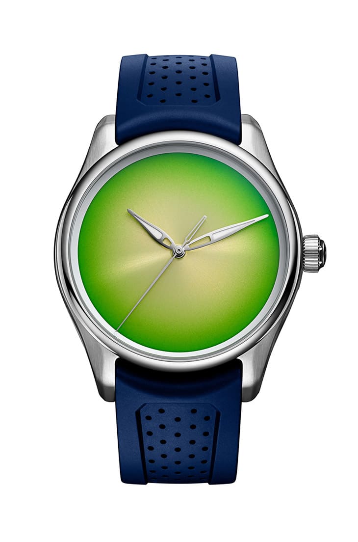 不可錯過的還有開拓者大三針柑橘綠概念錶(Pioneer Centre Seconds Concept Citrus Green),這只化繁為簡的大三針手錶,遠遠望去會先注意到它清新的漸層綠色面盤。手錶的不鏽鋼錶殼搭配深藍色橡膠錶帶,面盤除了指針之外沒有任何的品牌標誌、刻度與時標,純粹以柑橘綠色展現出極致簡約的高明設計功力,經由太陽放射紋修飾後的面盤好像會從中央散發出醉人光芒,不花俏卻又極盡搶眼之能事地展現亨利慕時反叛逆的一面。