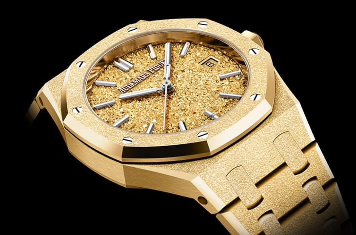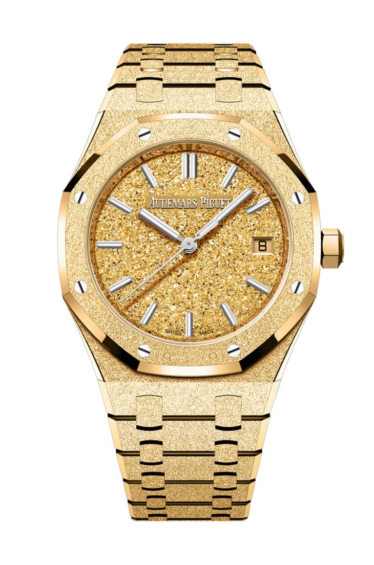 新登場的皇家橡樹霜金自動錶尺寸為34mm,愛彼分別延伸出黃金與白金等兩種款式,它們皆以品牌獨門的霜金工藝修飾錶殼與鍊帶等零件外觀,這種遠看效果和鑽石有異曲同工之感的工藝原本來自高級珠寶領域,2016年時愛彼與珠寶設計師Carolina Bucci合作,將傳統珠寶界應用於配件的佛羅倫斯黃金錘擊技術引進製錶過程中,大致而言這種工藝是用鑽石工具在K金表面錘擊出細微凹痕,等待零件表面細膩敲擊出數量豐富的痕跡後,在光線反射下其能表現出比整片拋光還要強烈的光影效果,同時也讓手錶不易出現細微的刮痕,成為保護手錶外觀以及美觀裝飾一舉兩得的絕佳技藝,自從愛彼引進霜金工藝後,如今帶有這種設計的手錶益發售到層峰市場喜愛。