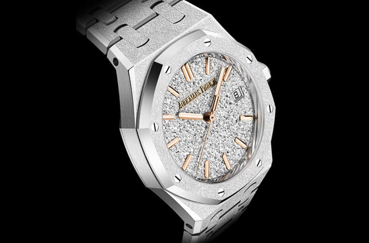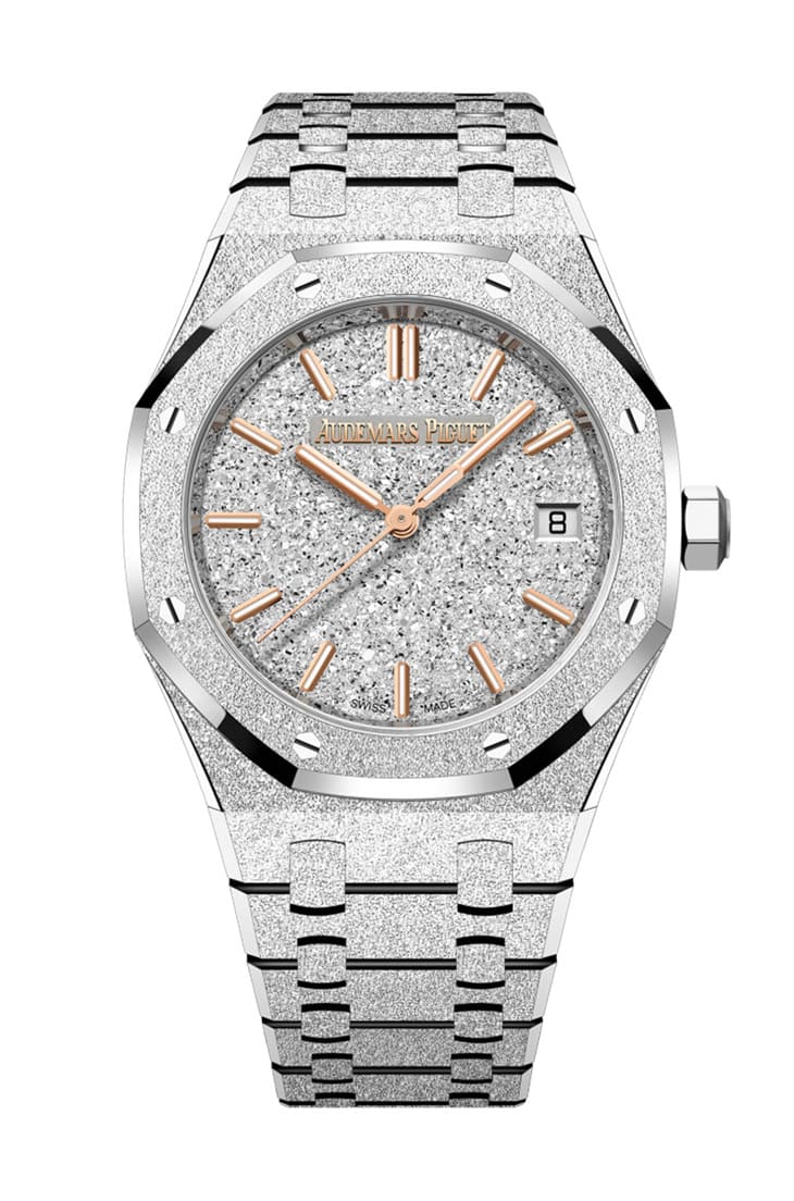 皇家橡樹霜金自動錶的外部零件修飾工藝和皇家橡樹迷你霜金石英錶彼此呼應,至於前者的大三針格局面盤則讓人想起Royal Oak Perpetual Calendar "John Mayer" Limited Editon。新款皇家橡樹霜金自動錶面盤不使用系列招牌的Tapisserie格紋點綴,而是改用首見於John Mayer特別版的「晶沙」(Crystal Sand)工藝。