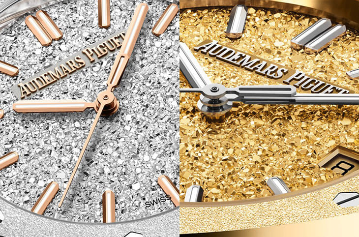 製作晶沙面盤的基底仍是常見的黃銅材質,愛彼先以沖壓技術取得貌似水晶般的不規則晶體形狀,接著用電鑄金屬沉積工藝將面盤覆上金色或銠色鍍層,因此面盤凹凸有致的紋路其金屬光澤都能顯得均勻晶亮。愛彼為了強化閱讀時間的直覺性與清晰感,替黃金款配上白金時標與指針、替黃金款配上玫瑰金時標與指針,如此一來手錶便不會整只都金黃色或銀白色,色彩的對比感讓人可以一目瞭然時間軌跡。面盤12點方向以電鍍沉積工藝製成的“AUDEMARS PIGUET” Logo與兩款的時標與指針同色,此外3點方向的日期盤則會視面盤顏色分別使用金底黑字或白底黑字,由此展現出手錶彼此的個性。
