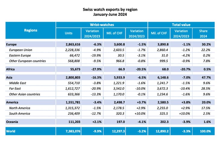 ▲瑞士鐘錶業聯合會(FH)公佈的瑞士手錶2024年上半年出口表現。