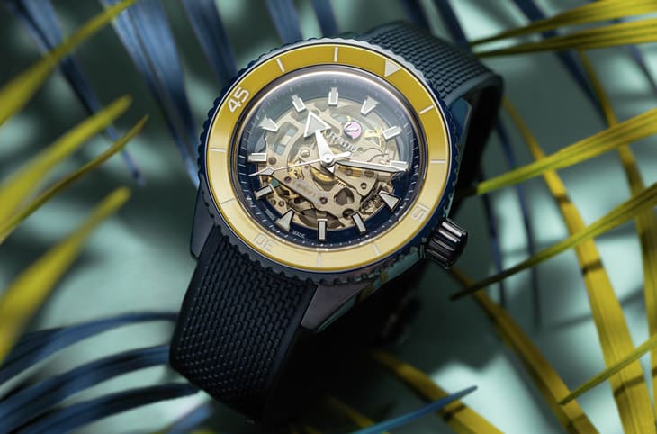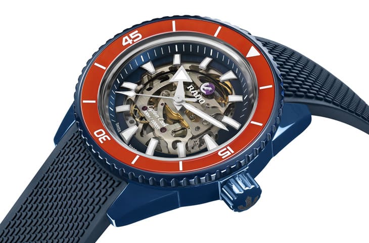 而庫克船長高科技陶瓷鏤空錶新作分別有兩款,它們都是以藍色高科技陶瓷製作錶殼、搭配霧面藍色橡膠錶帶(扣面同為陶瓷材質),不過一款的錶圈為橘紅色陶瓷襯片、一款錶圈則是黃色陶瓷襯片,展現出同中求異的色彩組合,但同樣能夠讓人聯想起夏日的躍動氛圍。兩款錶的錶圈每五分鐘刻度都設置漆面時標,並在12點鐘位置安排一枚塗有白色Super-LumiNova®夜光塗層的倒三角形標記,提供佩戴者進行下潛時間的計算。此外像是面盤的三枚指針以及時標表面也都有夜光塗層,即使在黑暗環境如水下,還是可以清楚辨識時間。