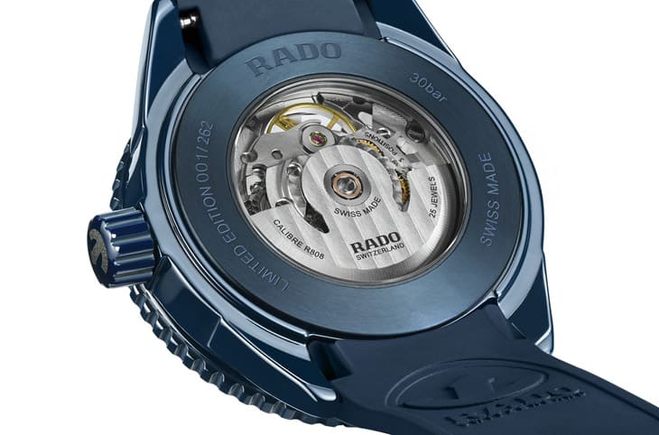 手錶的面盤也採鏤空設計,佩戴者會注意到面盤側的零件經過水平拉絲鎳色處理,隱隱呼應12點方向可活動式的船錨標誌,明示其搭載自動機芯的設計。這兩款庫克船長高科技陶瓷鏤空錶搭載的也是R808自動機芯,從錶背的透明底蓋即可一窺機芯背面的組件以及其精密的作動。有別於真我方形系列鏤空錶的底蓋周圍呈現出金屬原色,庫克船長高科技陶瓷鏤空錶的透明底蓋周圍特別鍍上與錶殼顏色相近的藍色調,如此一來錶背看起來更和諧,也烘托出銀白色的機芯組件存在感,從底蓋邊緣鐫刻的資訊中可知,兩款庫克船長高科技陶瓷鏤空錶都是限量發行,各限量262只。