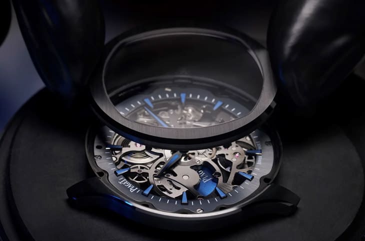 ▲錶款搭載的1200S1機芯將橋板與夾板鍍上黑色、微型自動盤則鍍上藍色,此外錶背可見手錶具備錶帶快拆系統。