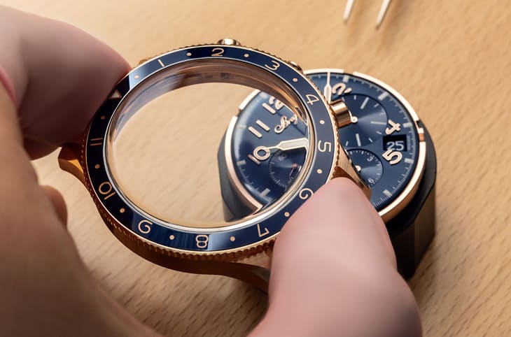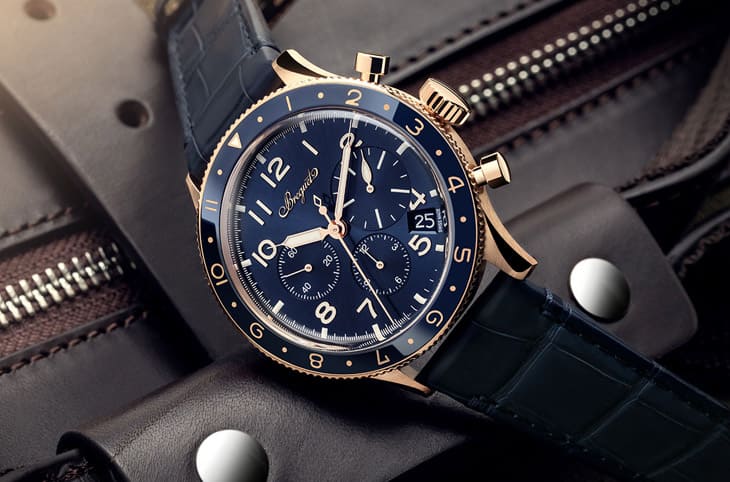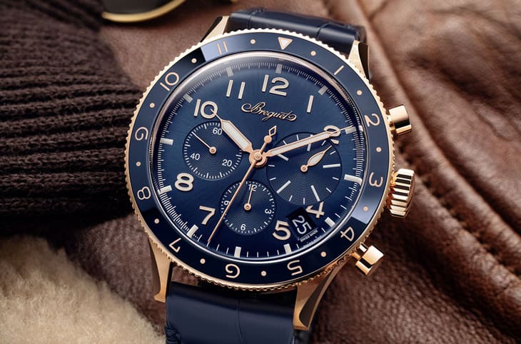 手錶的面盤有藍色太陽放射紋修飾,至於大小不一的藍色小錶盤則經過環形紋處理,使得與錶圈、錶帶呼應的藍色面盤呈現同中求異的視覺層次。寶璣此次替手錶鑲上金質阿拉伯數字時標,其與指針皆覆上夜光塗層(還有錶圈12點方向的倒三角形標記也有)以顧及手錶在暗處的視讀效果。