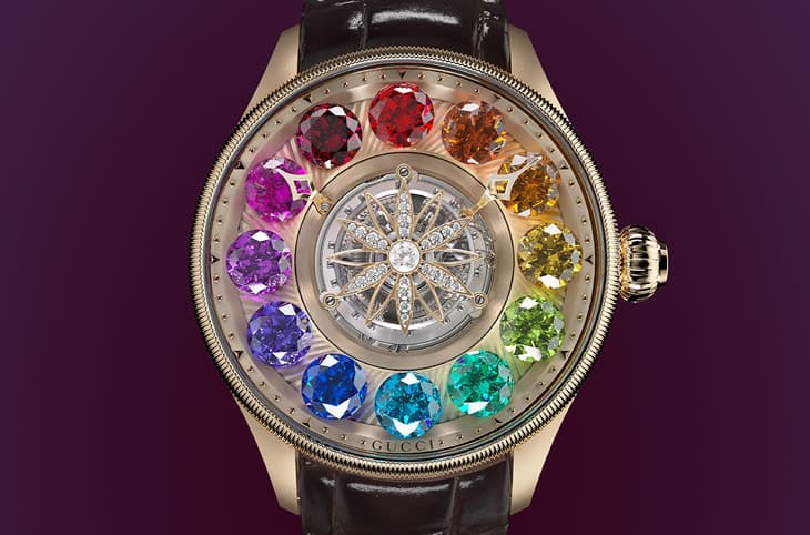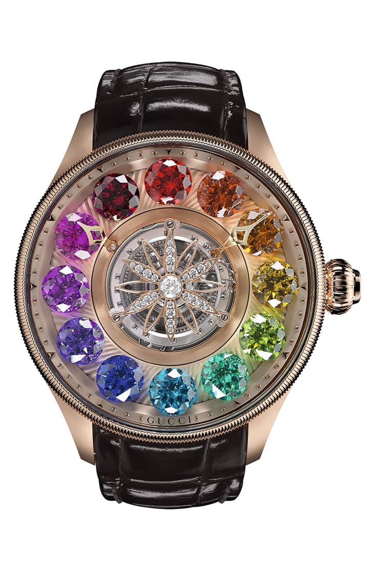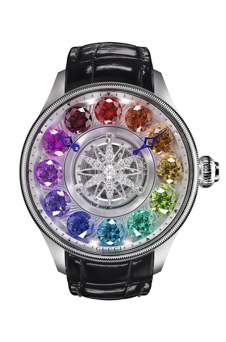 錶壇有部分手錶採用的彩虹圈設計甚得收藏家喜愛,其在錶圈鑲上五彩繽紛的寶石,賦予手錶美不勝收的視覺饗宴。GUCCI創作的G-Timeless Planetarium飛行陀飛輪展現出比彩虹圈青出於藍的華麗美感,這款作品外型為相對傳統的圓形錶殼,纖薄錶圈飾有錢幣紋,面盤內部格局又是中置陀飛輪,GUCCI豪邁地在陀飛輪周圍鑲上12顆碩大的彩色寶石,分別為蛋白石、石榴石、黃色綠柱石、橄欖石、碧璽、拓帕石、坦桑石、紫水晶及粉紅碧璽等等,寶石下方的機板另以機刻雕花烘托寶石的色澤與光芒,這些華麗的寶石平時能夠搭配指針作為時標,一旦按下與錶冠同軸的按把,單顆寶石會先自轉9秒鐘,然後全部寶石會再繞著面盤以90秒為週期轉一圈,過程中若再次按下按把則寶石則會立刻停止作動。除了寶石搶眼又大膽的設計之外,新款G-Timeless Planetarium飛行陀飛輪的陀飛輪框架也改為鑲鑽花卉圖案,與錶背實底蓋上鐫刻的大小花卉圖案正反呼應,加上錶扣也鑲有數十顆鑽石,整只錶充滿令人陶醉的各式「睛」豔細節。