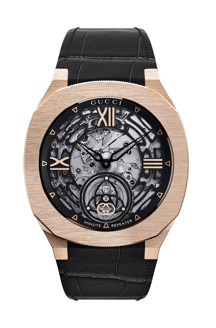 品牌採用白金或玫瑰金製作,手錶尺寸40mm顯得大小適中,而最令人驚豔的是錶殼厚度僅9.9mm,纖薄程度勝過多數問錶作品,此外錶殼經過緞面拉絲處理,搭配鱷魚皮錶帶鋪陳低調奢華的質感。這款作品從正面看不到錶冠以及三問啟動裝置,維持著相當簡約俐落的線條,其中前者為25H特色的隱藏錶冠設計,將錶冠包覆進錶殼右側線條,而後者則是相當少見又富有品牌特色的新設計。25H三問報時陀飛輪面盤以開面設計露出機芯的複雜結構,其面盤外圍融匯3點、9點與12點羅馬數字時標的鏤空橋板細看似乎有經過特殊設計,原來這是品牌從音波圖案獲得的靈感,搭配手錶的三問功能將這種抽象圖形轉化成為開面面盤上的裝飾。6點方向的陀飛輪框架巧妙結合Interlocking G標誌,象徵GUCCI不斷精進的製錶水準。25H三問報時陀飛輪搭載的手上鍊機芯零件數有340枚,於透明底蓋下可見其機芯背面右上角設有三枚音錘與繞行機芯兩圈的音簧,當佩戴者順時針旋轉錶圈30度時,便可以啟動三問功能,聆聽手錶鳴響出三種音調的鐘樂三問報時樂音,悠揚音色與手錶外型的鮮明風格相得益彰,大秀GUCCI後發先至的進階工藝實力。