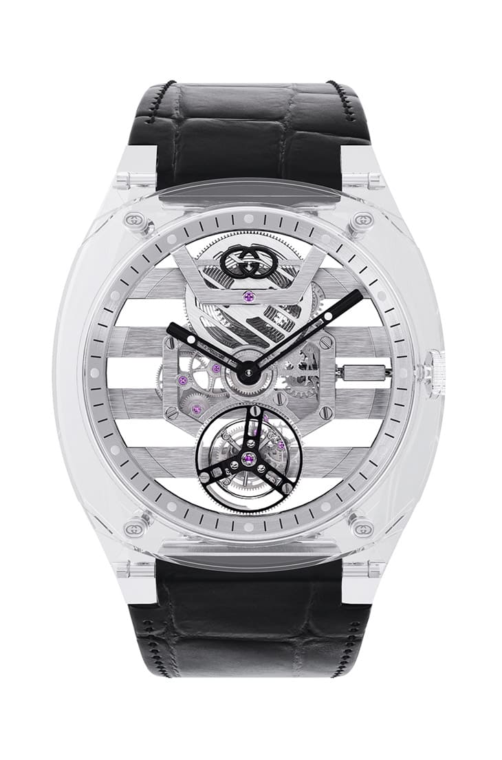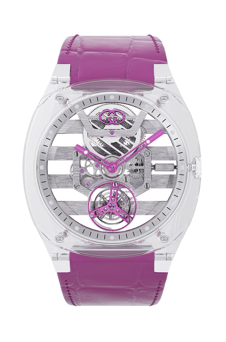 GUCCI將自家研發有成的藍寶石水晶透明錶殼技術與複雜工藝結合,造就出25H鏤空陀飛輪這款作品。手錶尺寸維持系列標準的40mm,其特色造型經過藍寶石水晶的詮釋下散發別樣魅力,而且這款作品的整體厚度僅8.2mm也很令人印象深刻,一般來說藍寶石材質的高硬度,要用來塑形的難度很高,而GUCCI不僅成功用藍寶石勾勒出25H系列的造型,也有效壓低錶殼的厚度,使其與內部的鏤空機芯搭配視野既廣又通透,還可以降低錶款重量,佩戴起來更輕盈舒適。品牌在相同的錶殼與鏤空機芯架構下,透過不同顏色如黑色或粉紅色點綴面盤12點方向的Interlocking G標誌、時、分指針以及陀飛輪框架,亦包含手錶的鱷魚皮錶帶,由此手錶的透明感便多了顏色裝點,散發同中求異的個性。