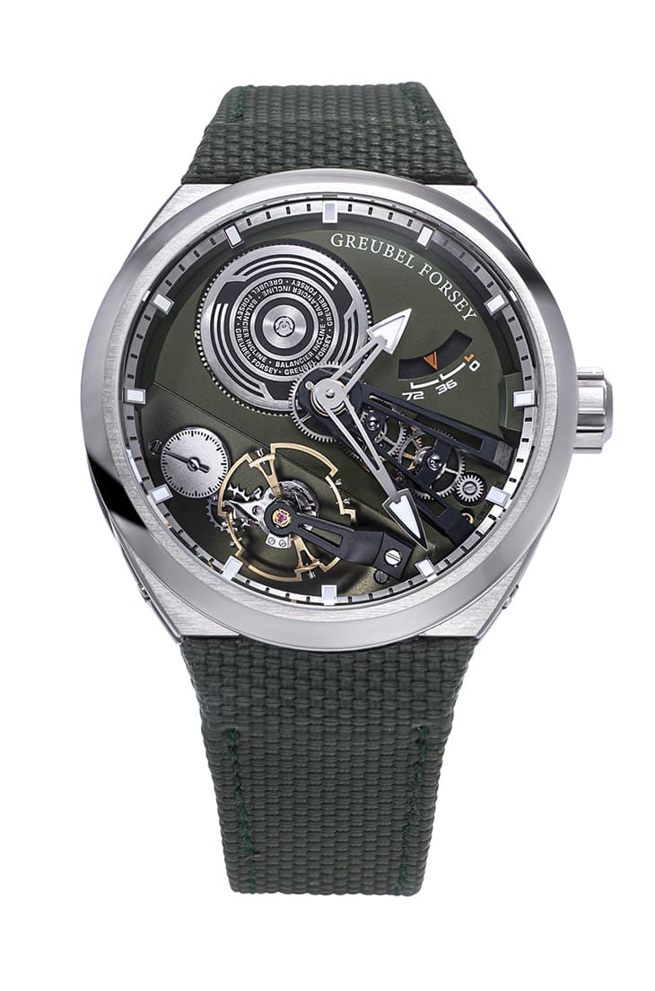 GREUBEL FORSEY再度運用類似現代建築般的手法,打造出Balancier Convexe S²的鈦金屬錶殼。其錶殼的凸面設計令藍寶石水晶與錶殼邊緣無如無縫般密合。開面下的深灰色機板上可見手錶獨特的雙拱橋結構,手錶猶如描繪城市天際線般,讓人聯想到現代五光十色的都市風光。面盤下半部傾斜的擒縱系統與小秒盤,與雙拱橋結構共同彰顯機芯複雜專利機制,不循傳統模式安排的面盤設計,展現品牌藝高人膽大的風格。此次展覽同時可見品牌與SHH限量合作生產的Balancier Convexe S² SHH Edition,錶款將面盤機板和背面底板都換上橄欖綠色,搭配同色調的織物錶帶,一股親切吸引人的氣質油然而生。