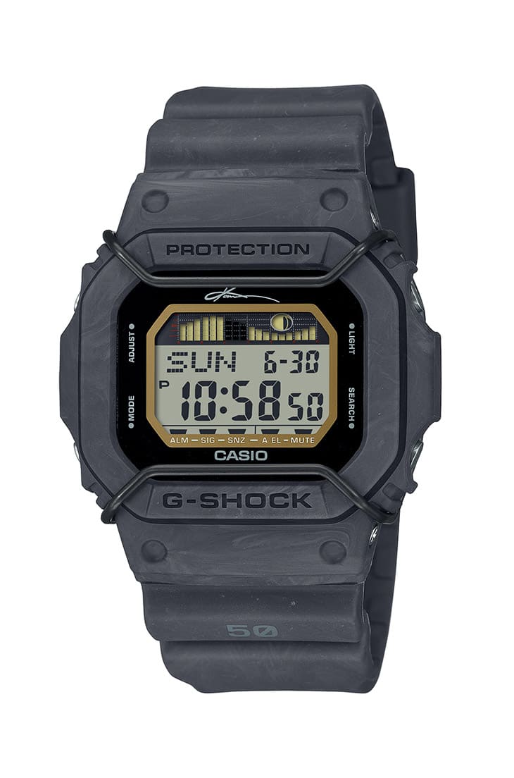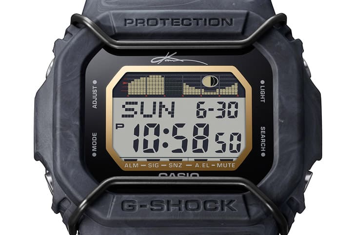 五十嵐卡諾亞這次和G-SHOCK聯名的作品奠基於後者G-Lide產品線中的GLX-5600型號,此型號特色包括提供潮汐圖、月齡、潮漲/潮退時間和水位,以及日出/日落時間等豐富資訊,儼然就是衝浪愛好者的天菜手錶。G-SHOCK採用生質樹脂製作GLX-5600KB的錶殼和錶帶等零件,五十嵐卡諾亞本身在手錶研發過程中也提出他的想法與創意讓品牌能夠據以發展出這位主人翁的特色,例如手錶外觀呈現不規則的黑色紋路,就像五十嵐卡諾亞平常在海上常見的波浪充滿有機獨特美感。