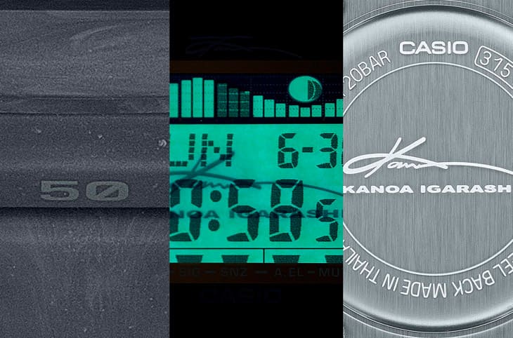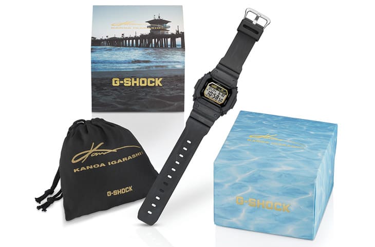 品牌特別替GLX-5600KB加上保護桿裝置以及在面盤周圍加上金色蒸鍍處理,同時細看手錶的細節也充滿這位頂尖衝浪選手的個人識別元素,像是EL背光照明、背蓋以及面盤中央頂部都有五十嵐卡諾亞的簽名字樣,而下半部錶帶上印有選手本身的號碼50。至於手錶的外盒包裝也富有巧思,外盒印上五十嵐卡諾亞常去衝浪的海灘景色照片,錶盒本身也印有蔚藍、沁涼的海水圖案(上頭在燙上金色的選手簽名與品牌字樣),讓人一拿到錶盒就可以感受手錶的熱情活力。
