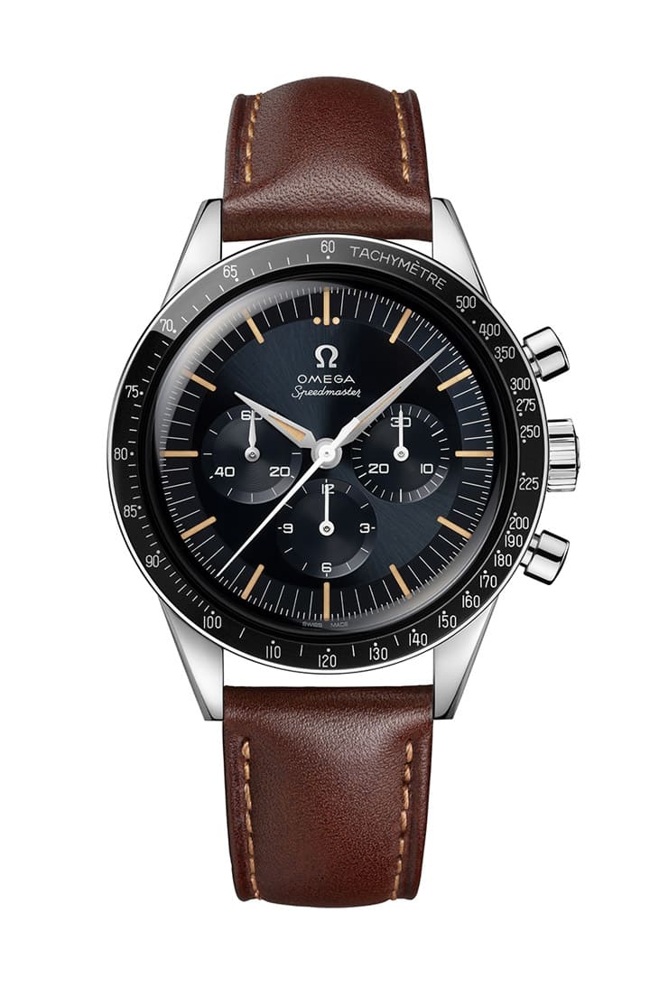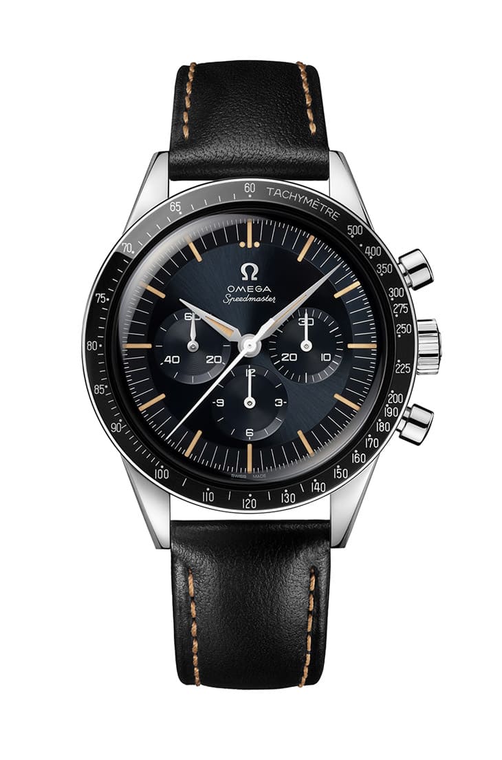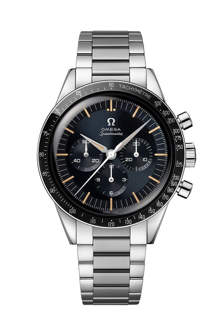 歐米茄新推出的超霸週年版系列The First OMEGA in Space一如既往採用不鏽鋼材質,錶徑也維持在39.7mm這樣的經典尺寸,同時錶殼也經過拋光與拉絲等雙重處理,至於計時按把、錶冠造型等則是於1959年的初代作品一脈相承。新款配上黑色鋁圈,有別於2018年復刻把錶圈改成了脈搏計刻度,這回品牌再度將刻度換回原汁原味的測速計,可以想見超霸系列招牌的「數字90上方圓點標誌」設計也會跟著一起回歸。