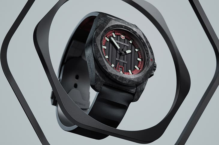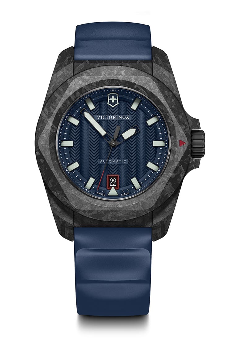 至於碳纖維款的I.N.O.X. Automatic腕錶則以雄偉的瑞士山脈和寧靜山谷為靈感,如錶殼呈現出強而有力的形狀和曲線、面盤的人字紋也像極了層巒起伏的山峰,此外六角形錶圈彷彿由小型袋裝刀精雕細琢而成,就連秒針的配重設計也呼應著瑞士軍刀造型,設計細節圍繞著瑞士維氏的品牌精神與其發跡地的自然景致。